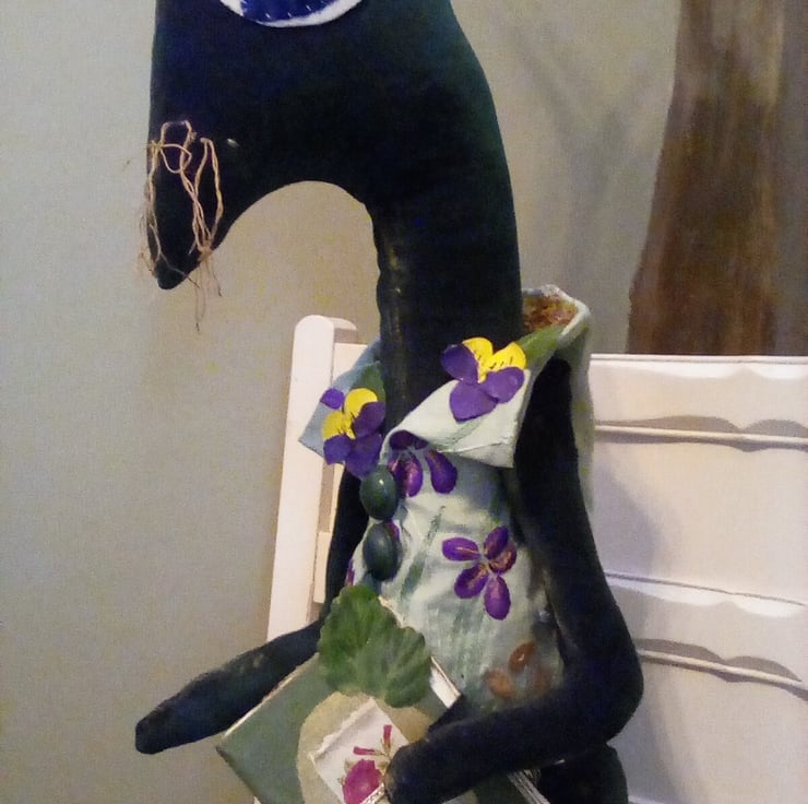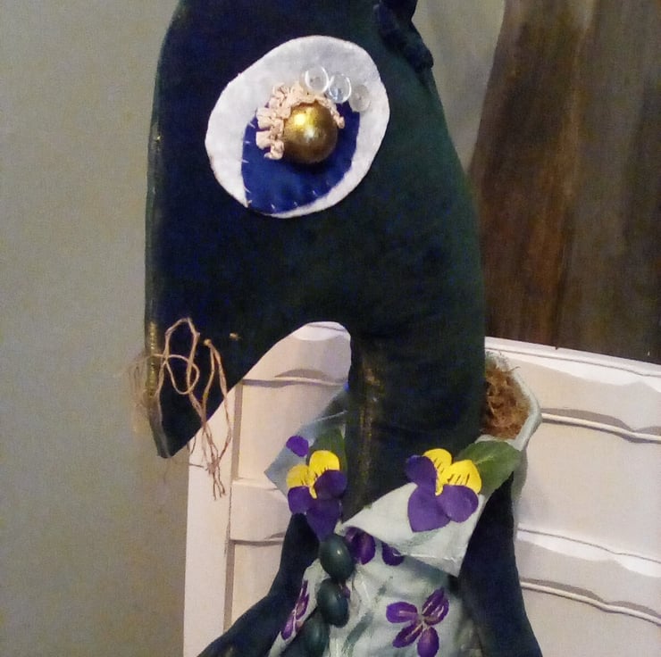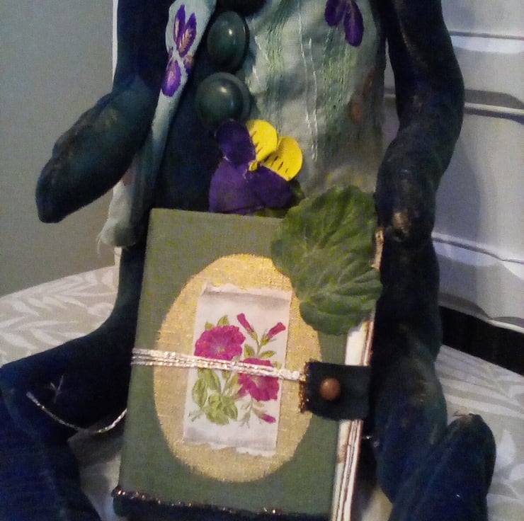 This bunny was lovingly hand made in green velvet, she has a gardening tgem, I hand crafted a waistcoat using an embroidered vintage linen, added buttons,hand painted textile violets, lots of stitched and glittering details.