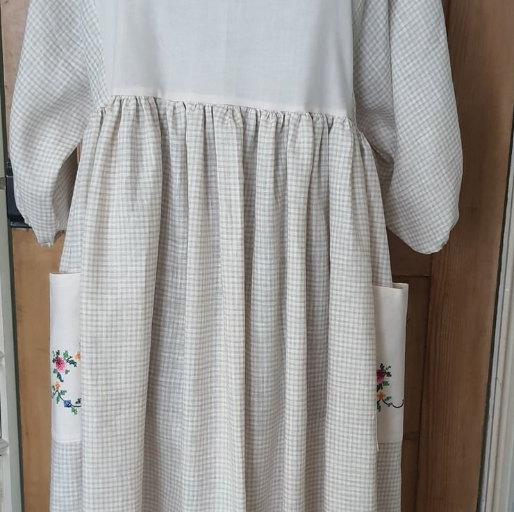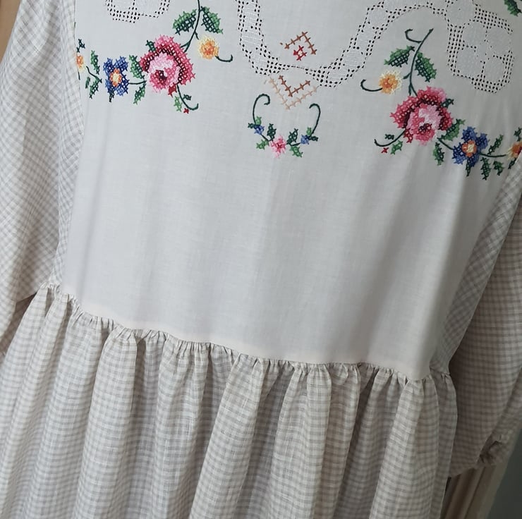 This gorgeous free fitting dress is made from stunning vintage embroidery and natural linen gingham and is totally unique. It will comfortably fit up to size 16 and is 43 inches long from back of neck. It also has two embroidered pockets