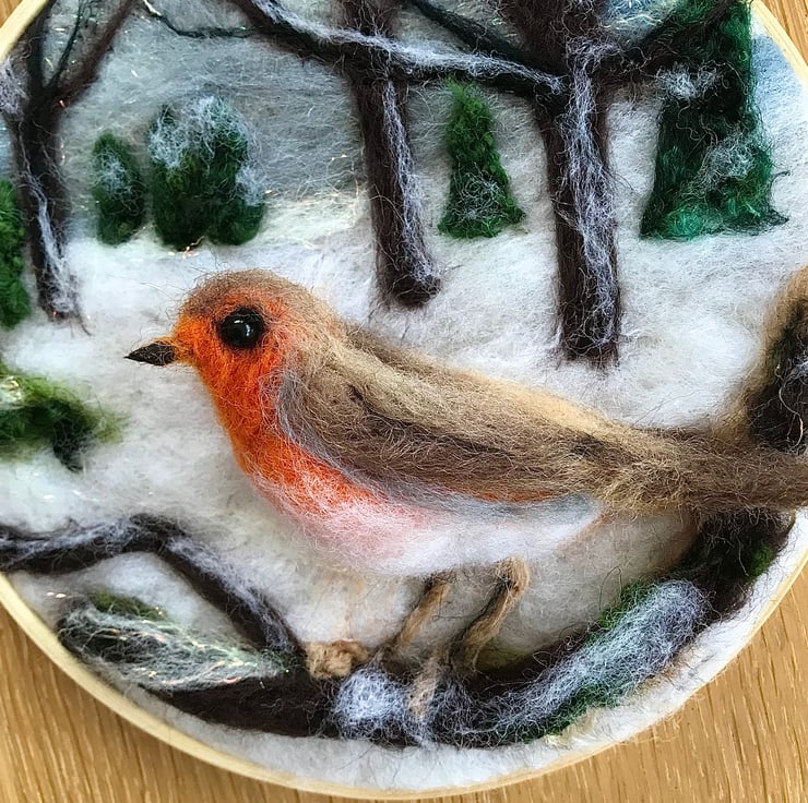 Winter robin needle felted picture.