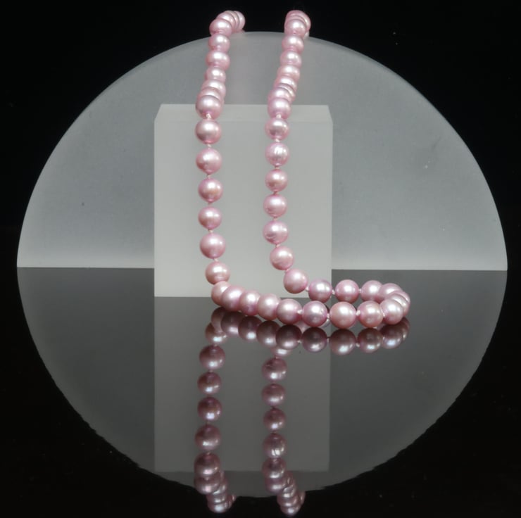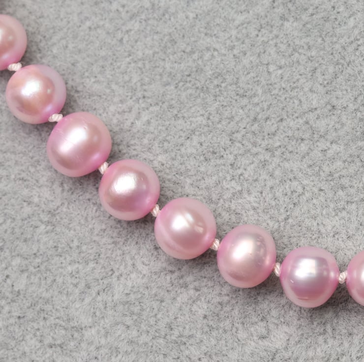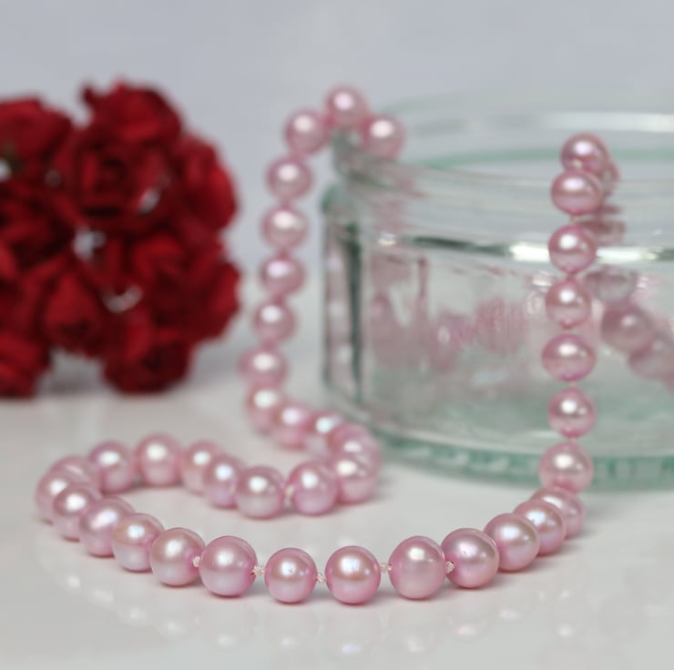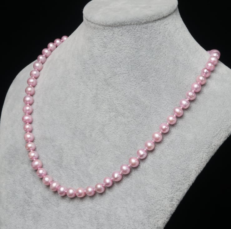 A delightful gift for someone special; an elegant freshwater pearl necklace. The pearls have been dyed a pretty pink. The supplier describes these pearls as ‘near round’; they are often referred to as potato pearls.