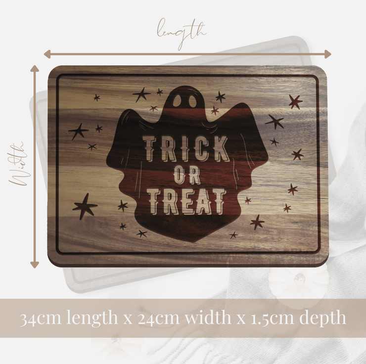 Add a touch of spooky charm to your kitchen with our "Trick or Treat" Acacia wood chopping board! Perfect for Halloween lovers, this beautifully engraved board combines functionality with festive flair. Made from premium Acacia wood, known for its durability and striking grain patterns, this cutting board is ideal for everyday use or as a statement piece in your seasonal kitchen decor.