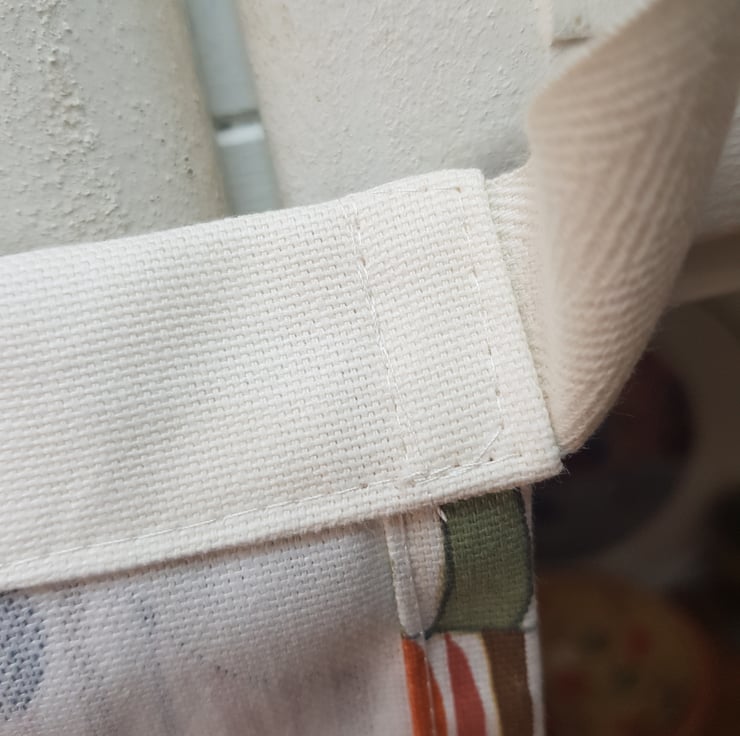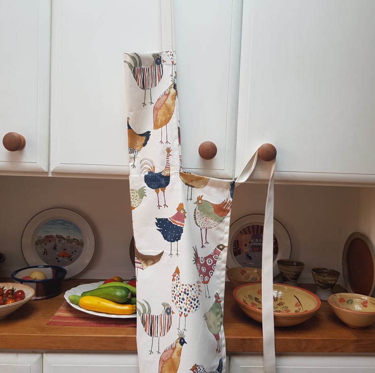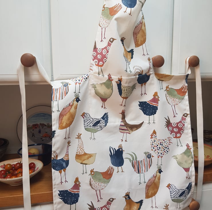 This cheerful apron is styled on a favourite apron of mine. It has a super big pocket. This is a cotton, curtain weight fabric and the ties and neck strap are cotton webbing.