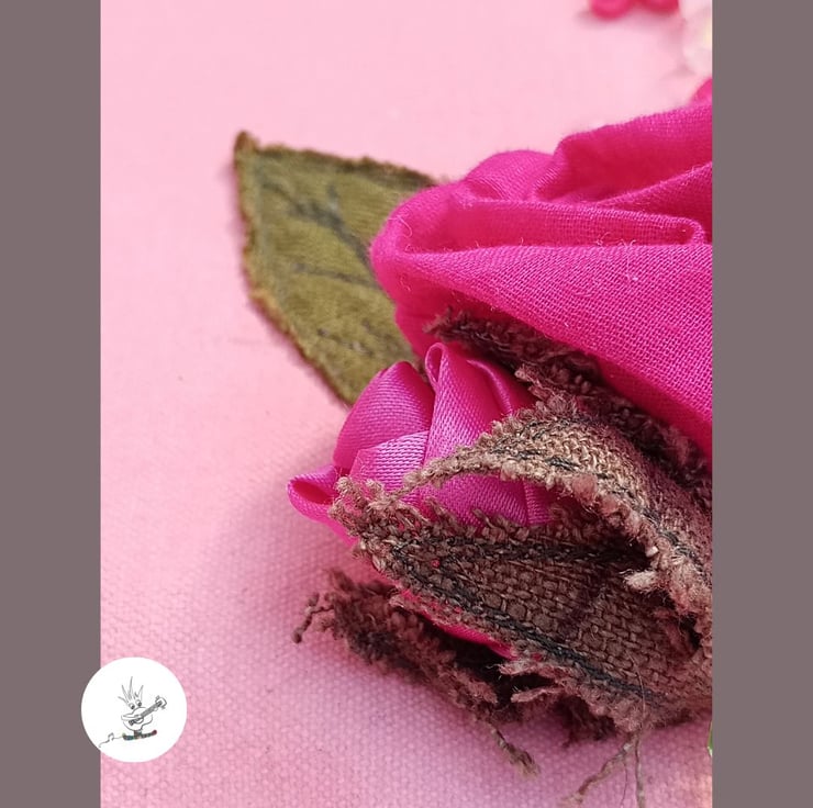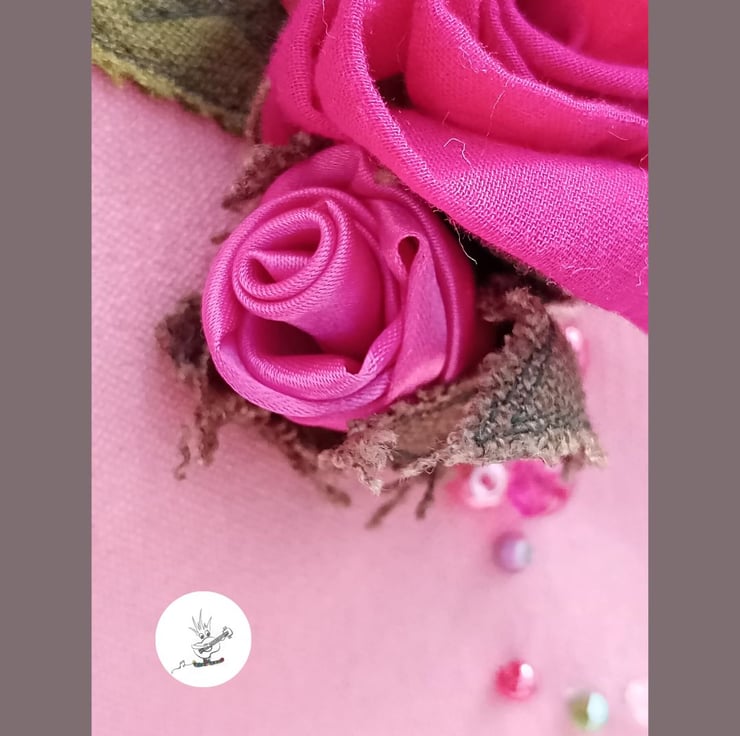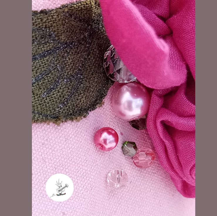 I have hand-painted the canvas a sweet, pink and complemented that with a brighter, quilted, satin lining and dark pink binding. I've added a strap in ditsy, rose-patterned cotton . It is 1.5inch (3.8cm) wide and adjustable in length. The case can be worn over the shoulder or cross-body. There is also a sturdy handle on one side and a long zip closure around.