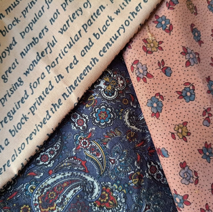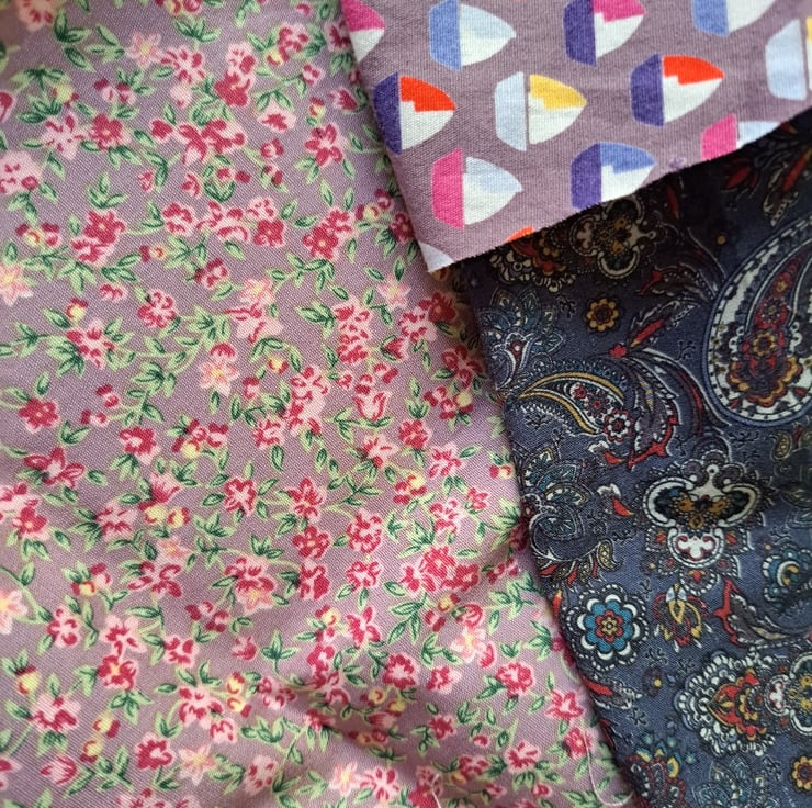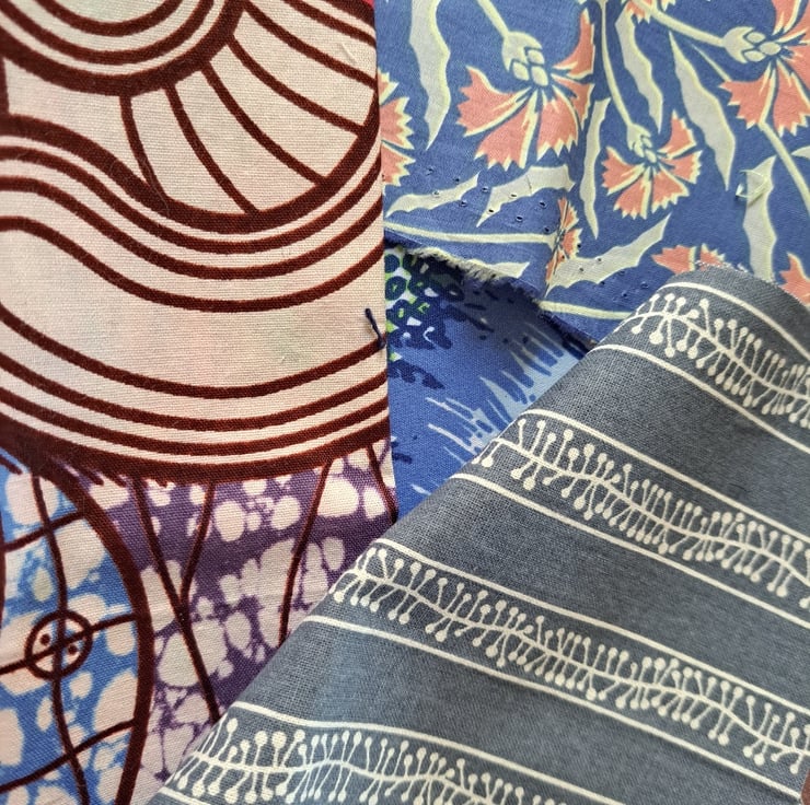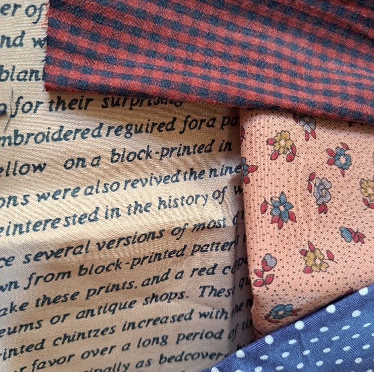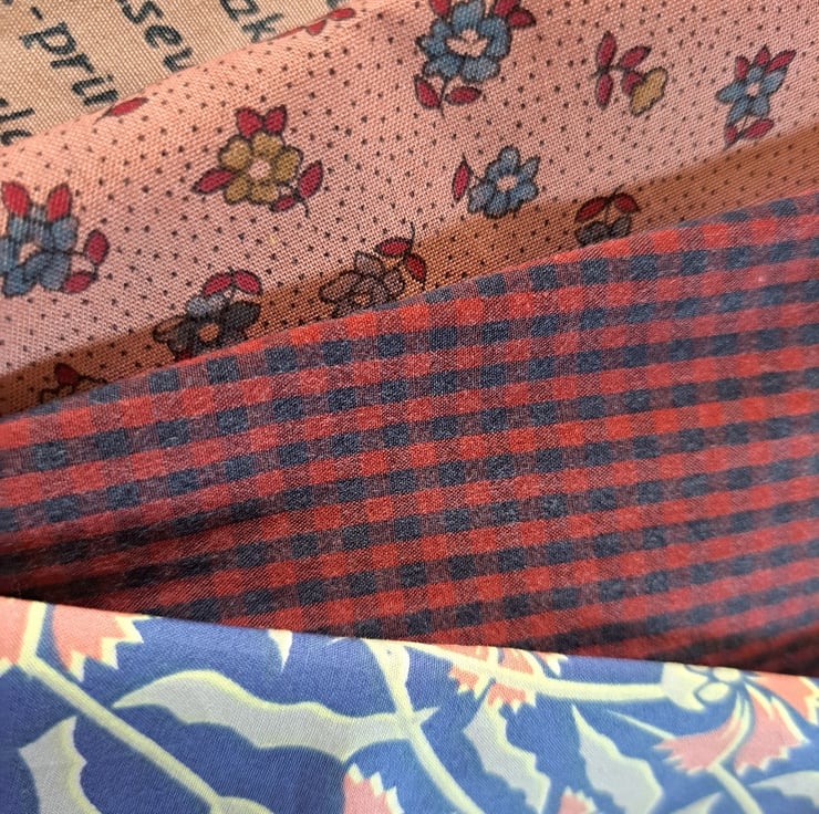 The dusky pink and mid blue in the small piece of fabric with a writing design inspired me to make up a bundle of similar colours. Here, then, are 13 pieces of blue and pink fabric, some rescued, some vintage, all cotton, all contributing to a lovely combination of mellow hues.