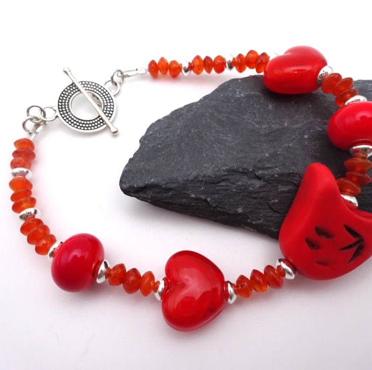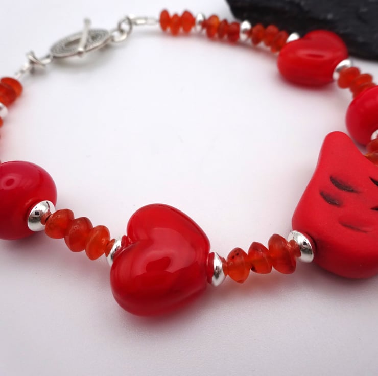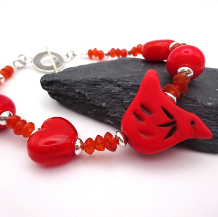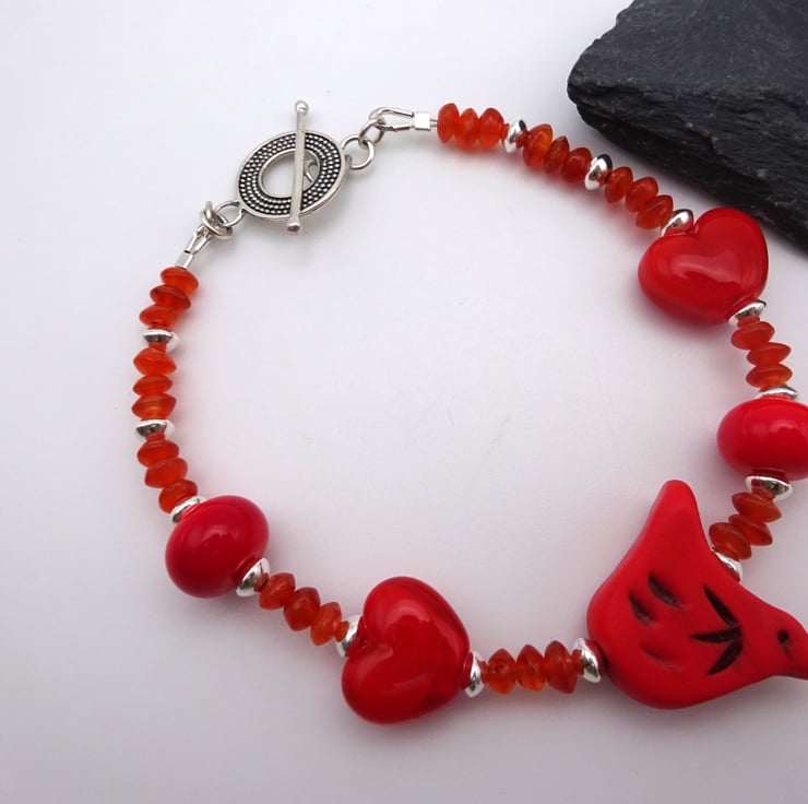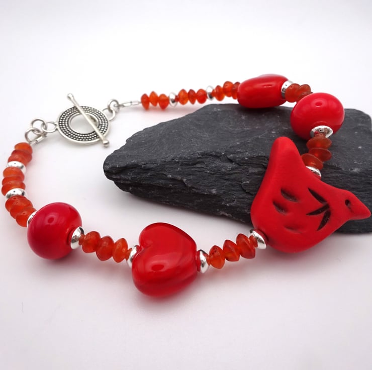 A bracelet made with red handmade lampwork glass beads, sterling silver beads, Carnelian gemstone beads and a handmade red polymer clay bird.