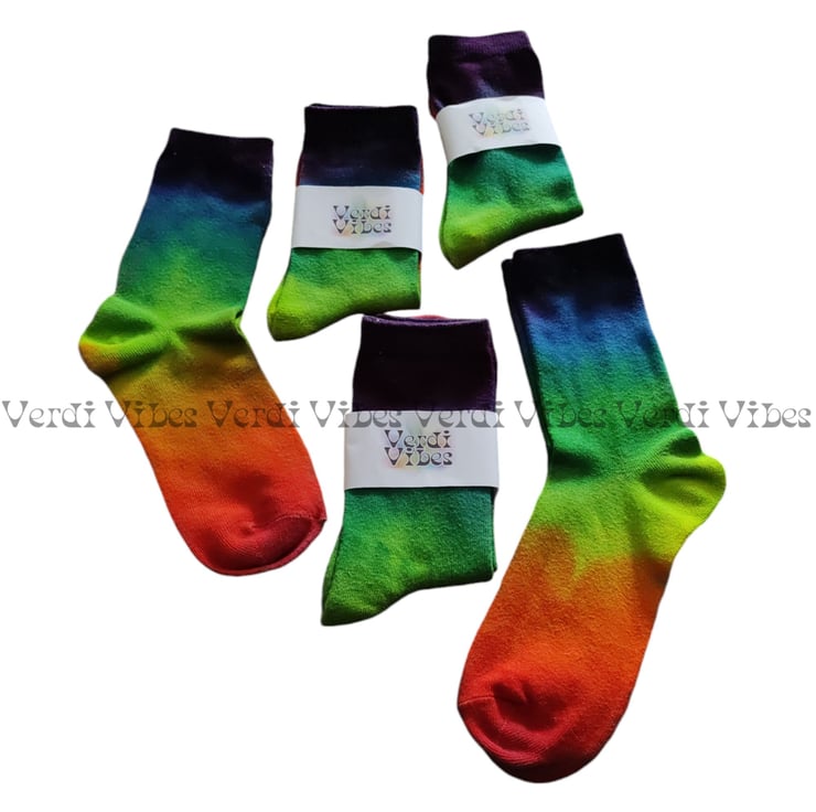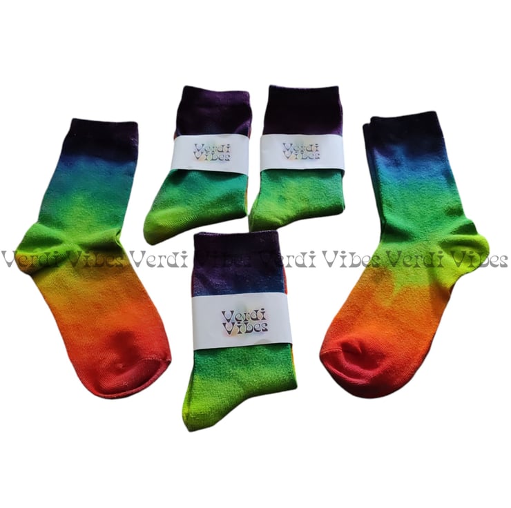 Each pair is carefully hand-dyed in a unique rainbow pattern, creating a one-of-a-kind design that is sure to catch everyone's eye.