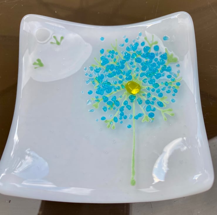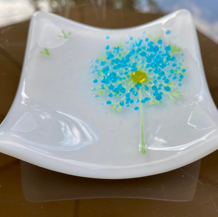 t-light candle, this little white glass trinket dish features a brightly coloured, hand-painted dandelion.