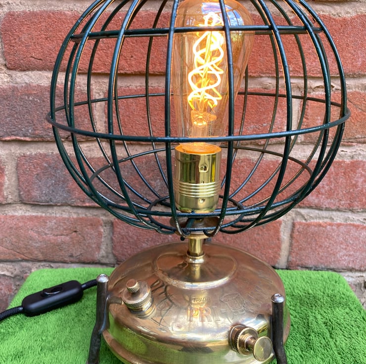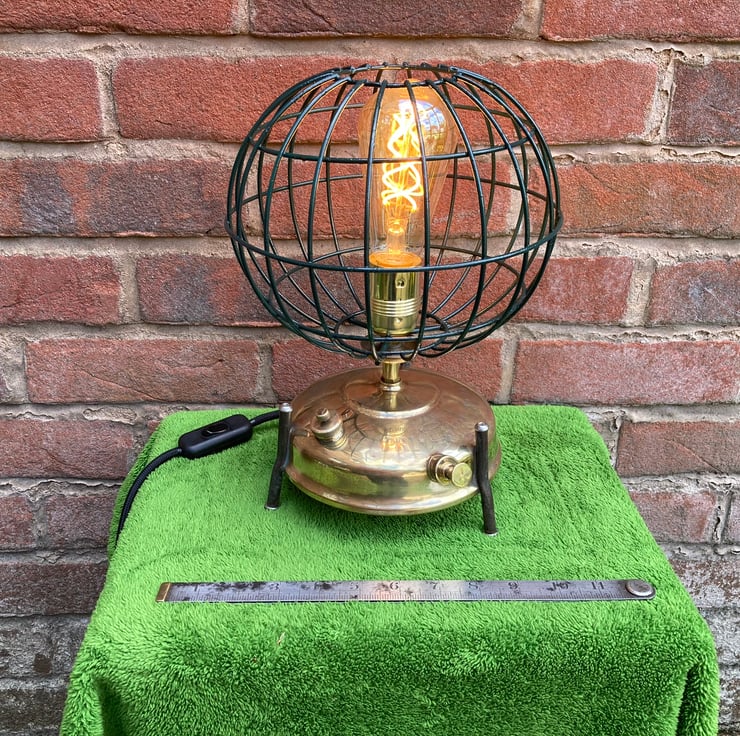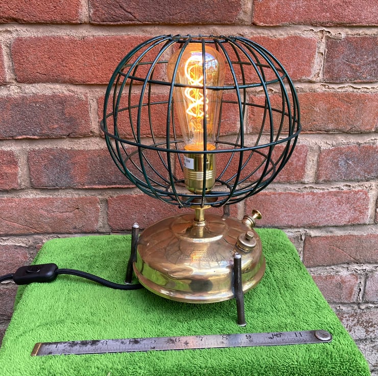 I removed the burner and fitted a brass ES lampholder on the original brass drip cup with a cage style shade made from a wire bird feeder with suitable brackets welded on and a coat of dark green quality metal paint. I cleaned and polished the brass but have made no attempt to get a high polish or repair the dents and scratches that hark back to its working life and make this a unique piece with real vintage character.