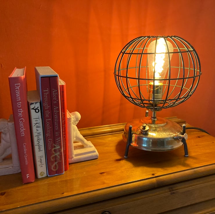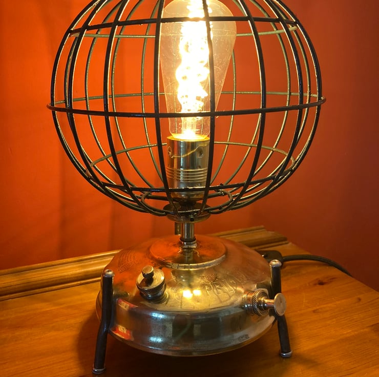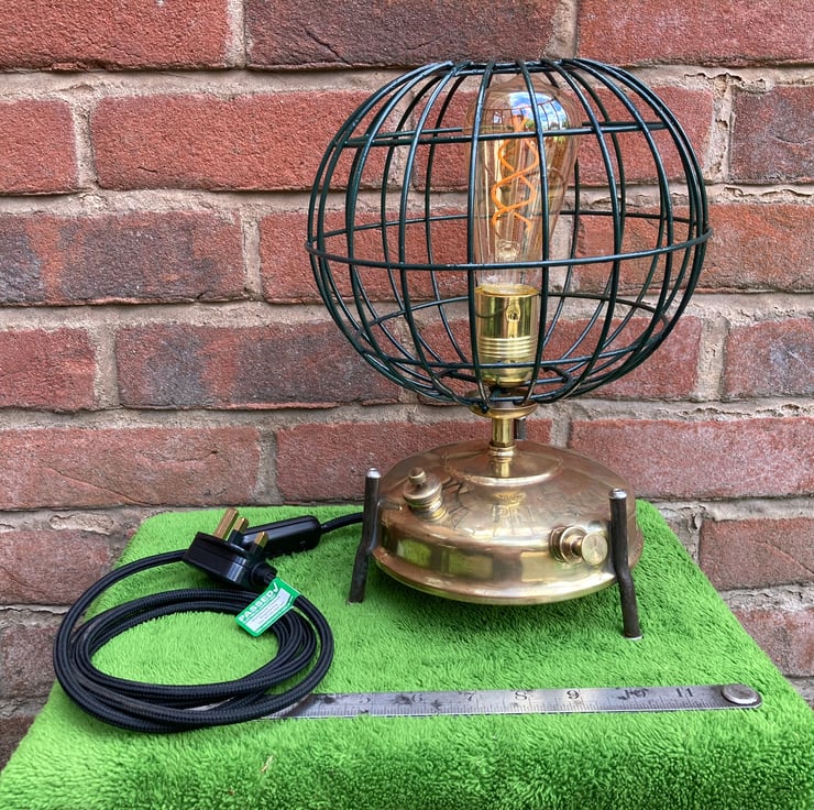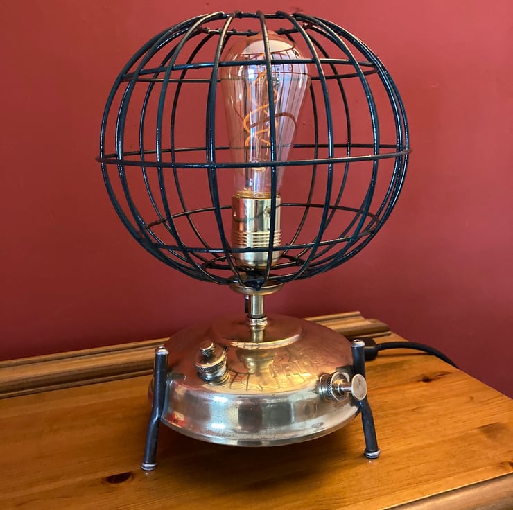 These brass paraffin camping stoves have a real steampunk look to them when given a polish, it just needed a little something to finish the conversion to a lamp off, enter an old bird feeder which Jane was throwing out which I have turned into a unique cage style shade!