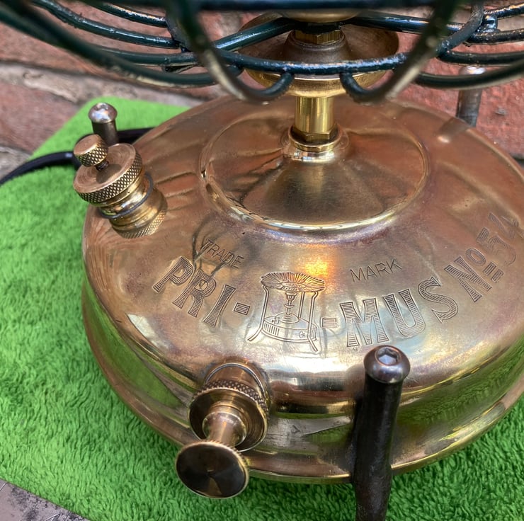 A wonderfully steampunk brass table lamp built around a Primus Paraffin stove. The Stove arrived with moderate tarnishing, most of which I have removed to reveal a well-preserved stove with a few dents that have happened in its 95 year life. The Primus date stamp ‘T‘ on the base signifies a production date of 1929!