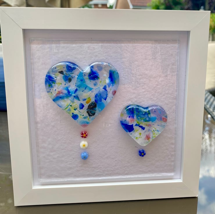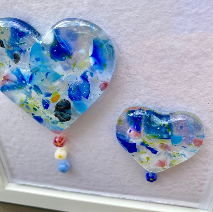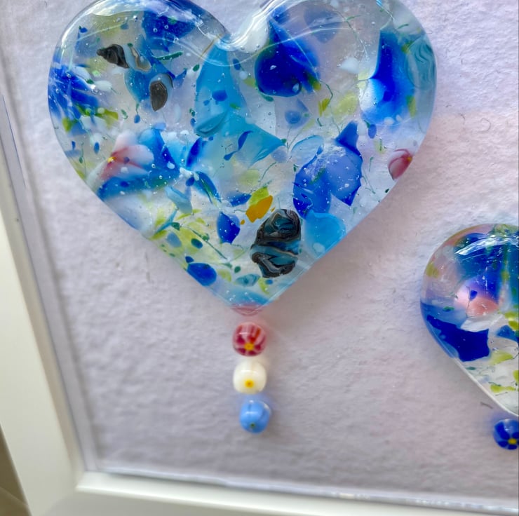The double hearts in this framed piece have been by layering many tiny glass pieces within a heart mould. This creates depth and a layering effect and when fired the glass elements look suspended within the heart shape. Blue is the main colour, together with some green and pink.