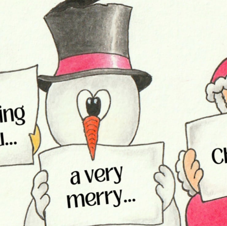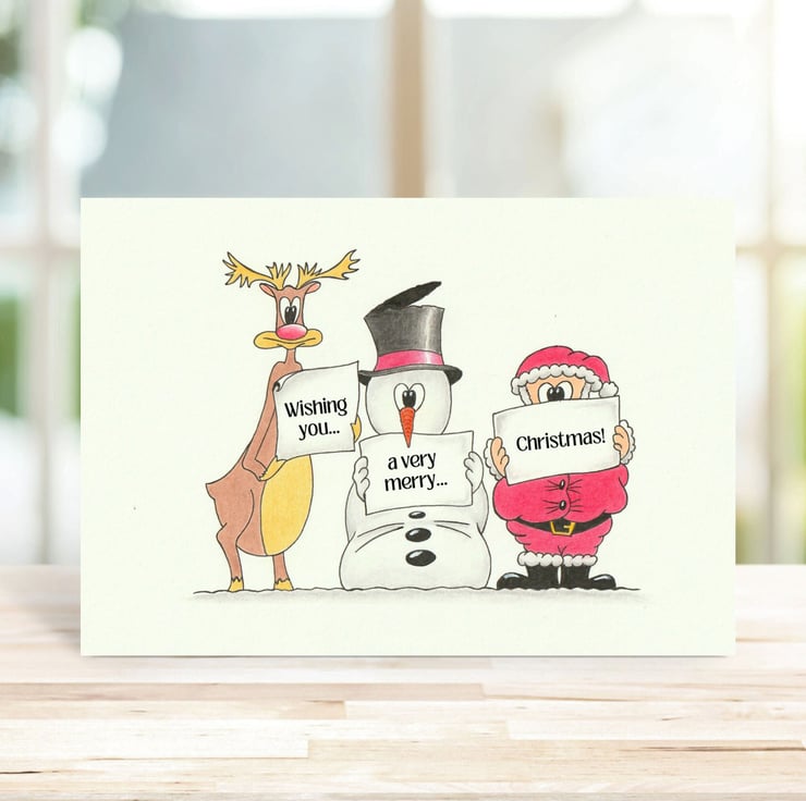 An original art greeting card featuring a hand-drawn pencil illustration of cute festive characters, wishing you a very Merry Christmas.