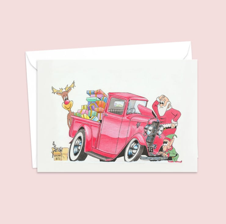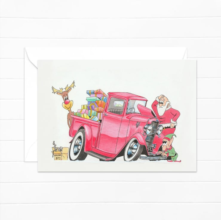 A fun card for the festive season featuring an original hand drawn pencil illustration. Engine trouble for Father Christmas and his little helpers!