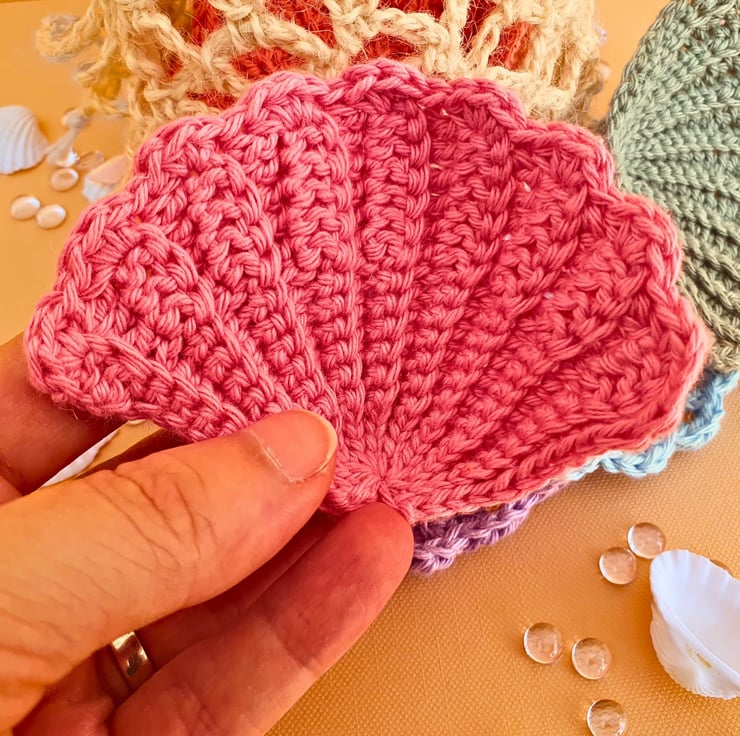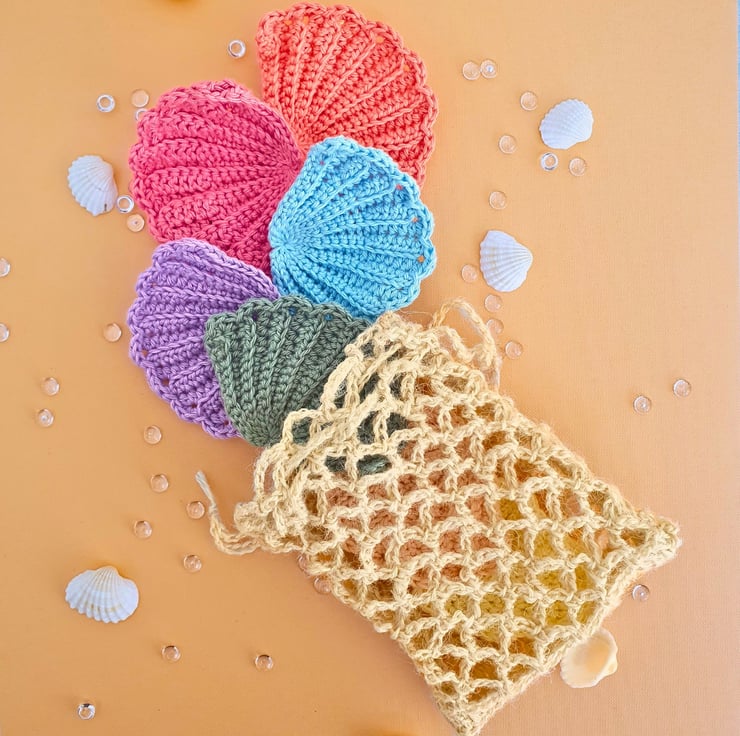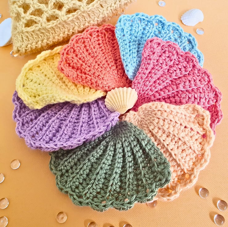 The face wipes / scrubbies are hand crocheted with 100% cotton yarn in various bright, pastel colours. They are in the shape of a seashell and they measure approx. 10x7cm (widest points). They can be used with your usual cleanser or water to remove make-up, and they can be washed (at max. of 40 degrees) and used again.
