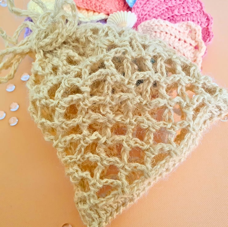 The wash bag is from 100% hemp yarn in cream, hand crocheted with a shell trellis pattern. It will keep your facial pads safe during the wash, and can also be used as a pouch to store them. It measures approx. 13x17cm.