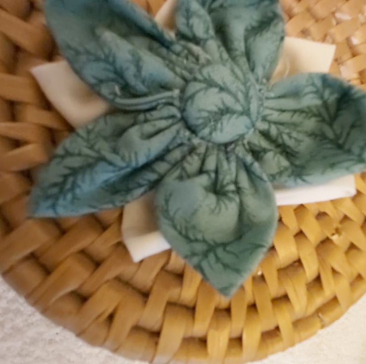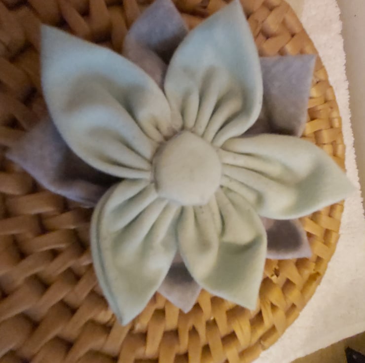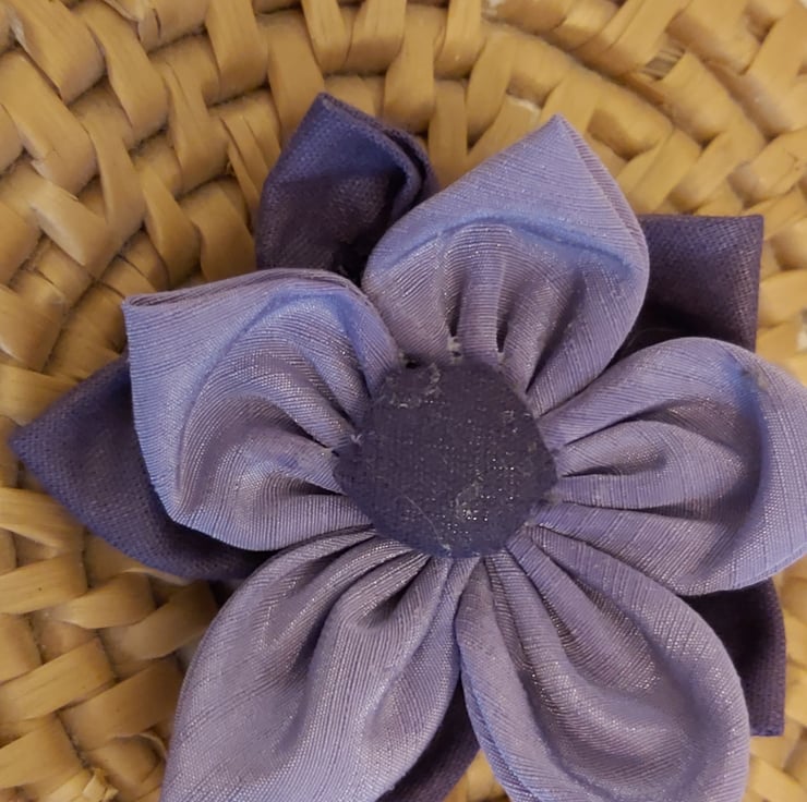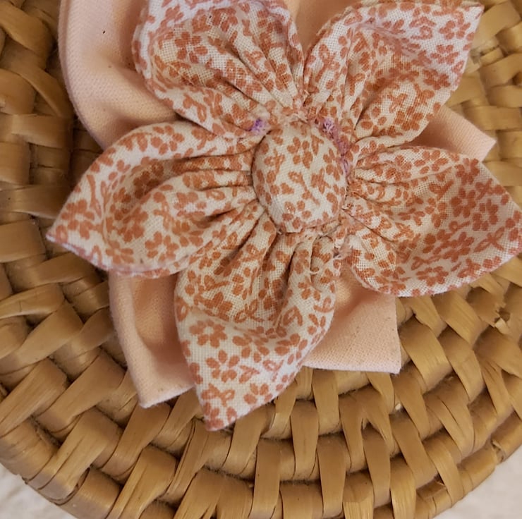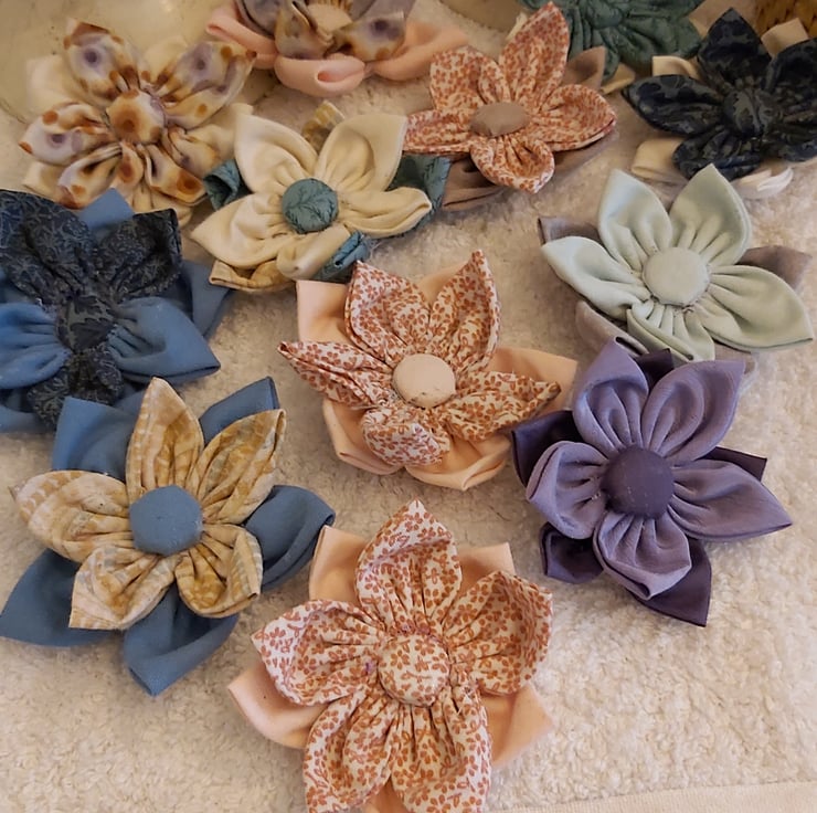 Handmade flower brooches. Multi coloured but co-ordinated patterned fabrics used to make the petals of a fabric flower. centred with a covered button. brooch pin on the back.