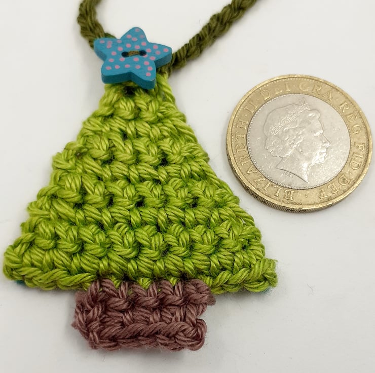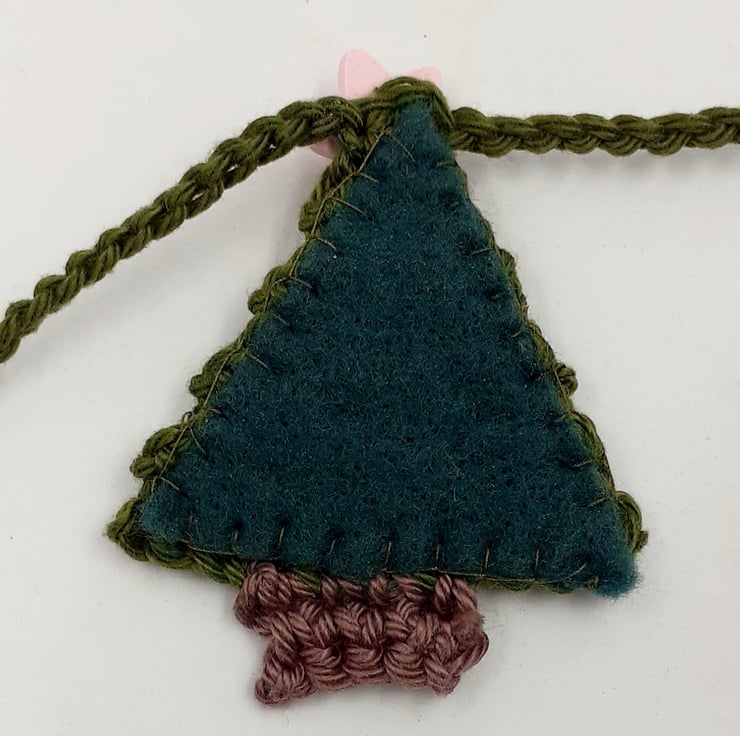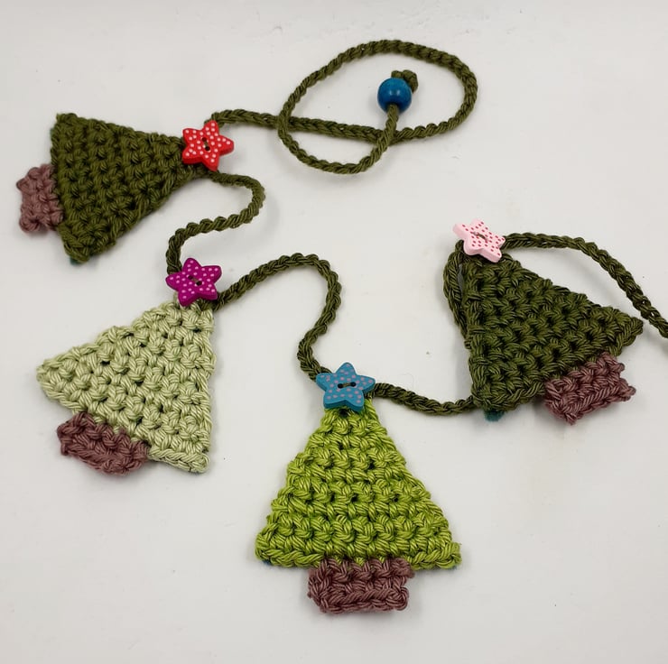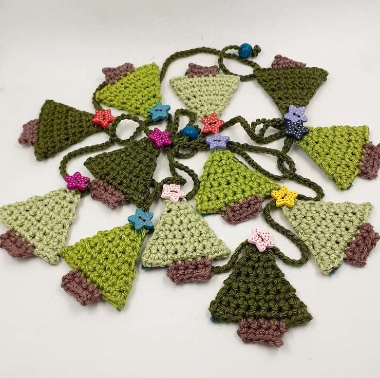 This pretty garland is crocheted in cotton and each of the 12 little trees is topped with a painted wooden star button. The trees are backed in stiffened felt and the ends of the 'string' are finished with painted wooden beads for easy tying. The whole garland measures approximately 150 cm and comes wrapped in tissue in a labelled PIP (Postage in Proportion) box all ready to be given or posted on.