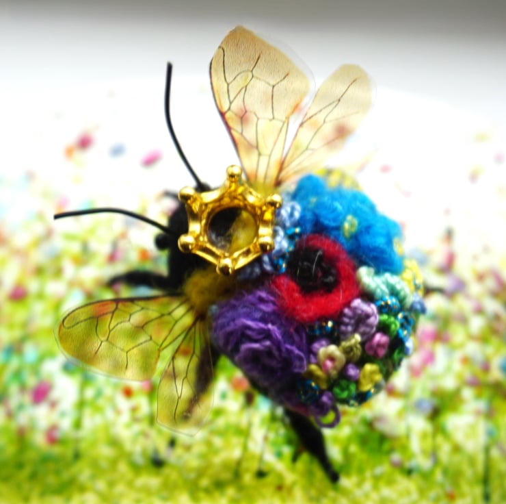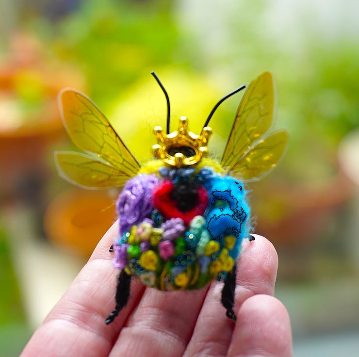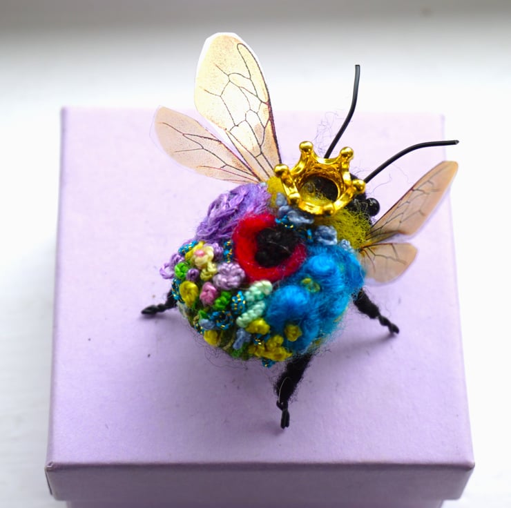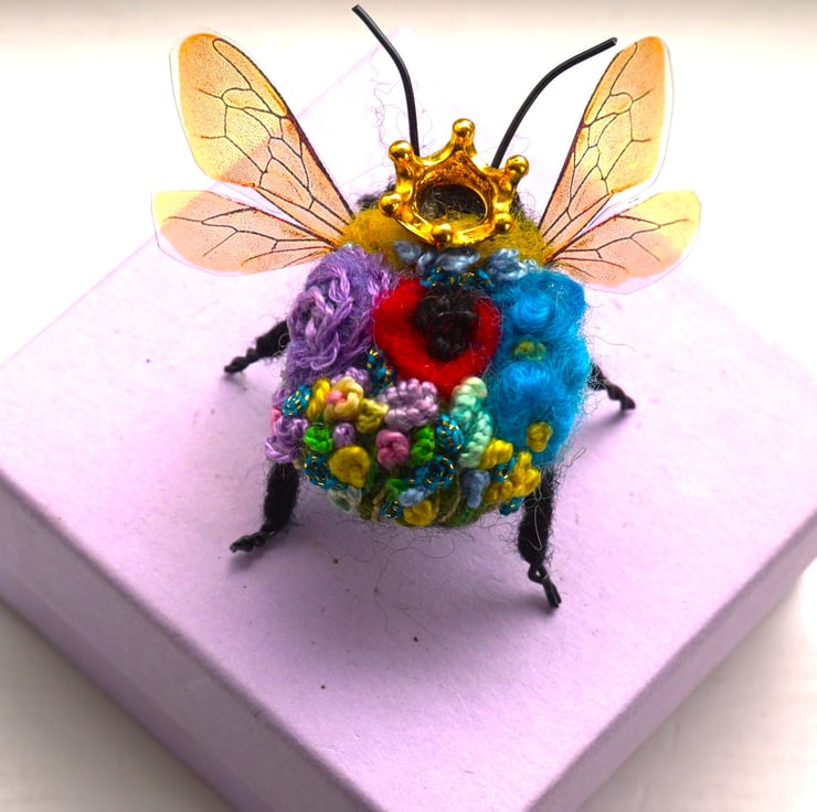 Needle felted and embroidered queenr bee, measures approx 3 cm long by 5cm wide .She has a little crown attached to her head.Your bee will come with a fine gold hanging thread ,which can be snipped off if not required,Gift box included.This is actual bee you can purchase.
