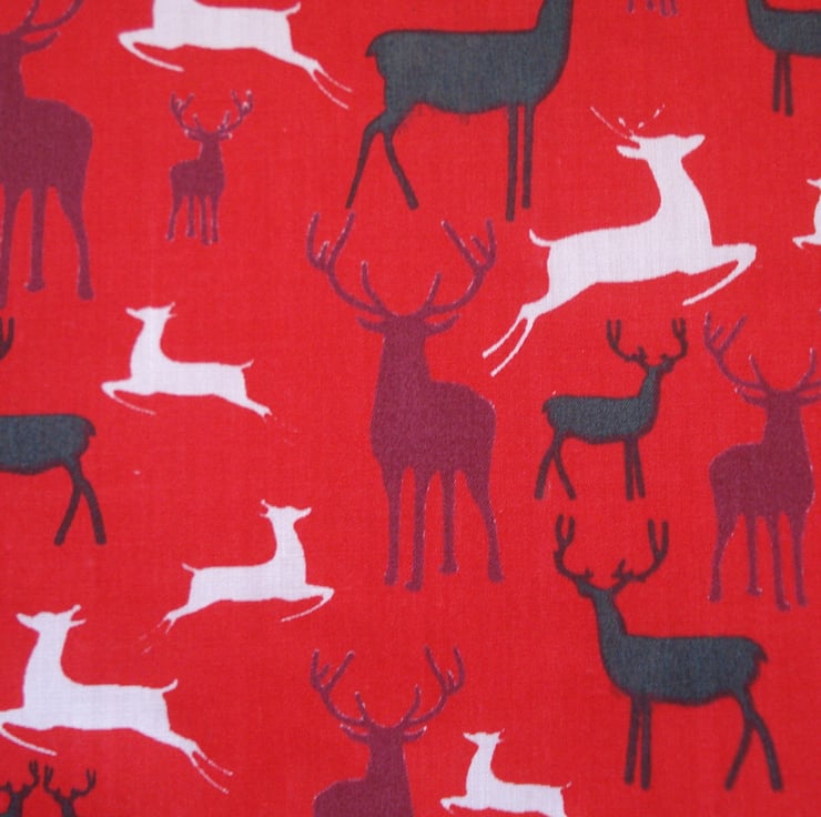 This is a handmade sewn tea cosy made from red fabric with a black and white reindeer pattern. There is a cream lining and a little tag at the top to hang it up. The lining can be pulled down to rinse it out. Would fit a 4-6 cup teapot. Makes a great Xmas gift.