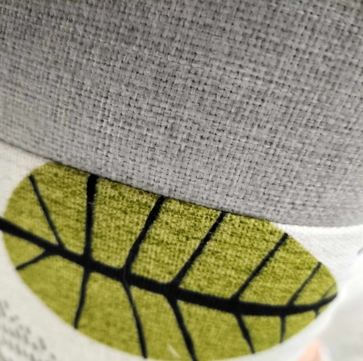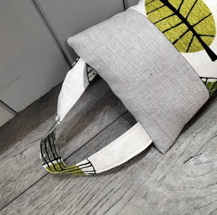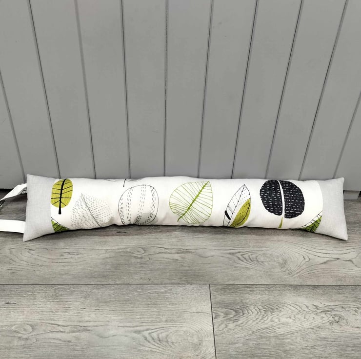 Lovely draught excluder with leaf design fabric, top and tailed with soft grey.