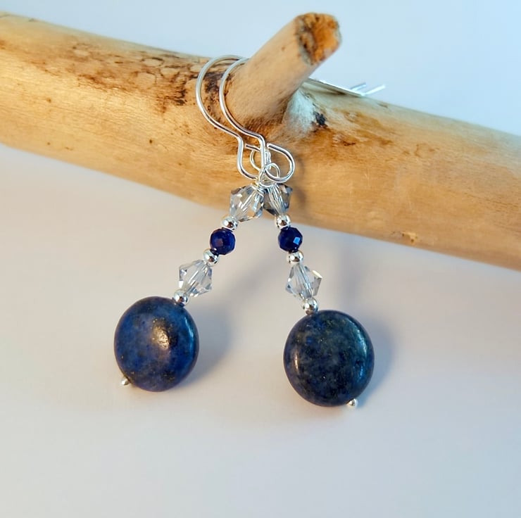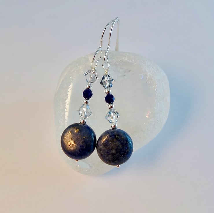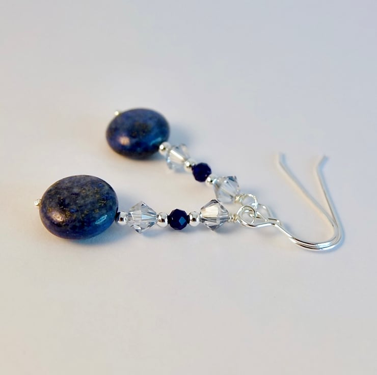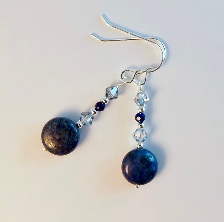 Each earring features a 10mm Lapis Lazuli coin bead, topped with two 4mm, high quality, Austrian crystals, in a colour called 'blue shade', a 2.75mm faceted Lapis Lazuli bead and tiny 2mm sterling silver spacers.
