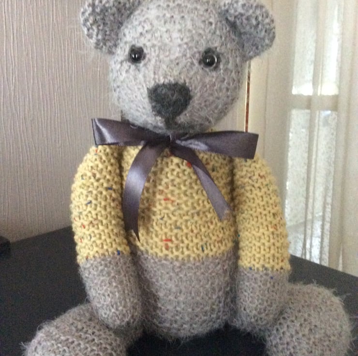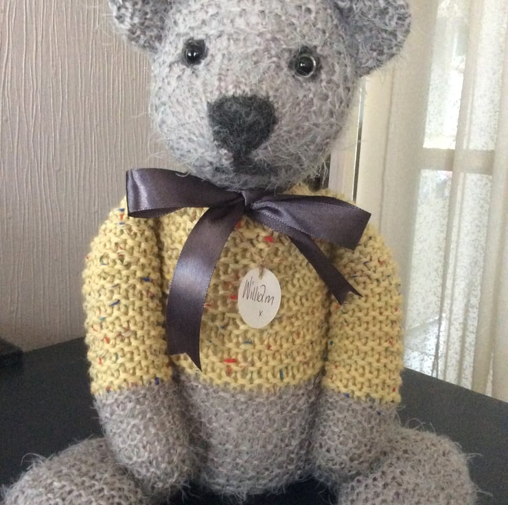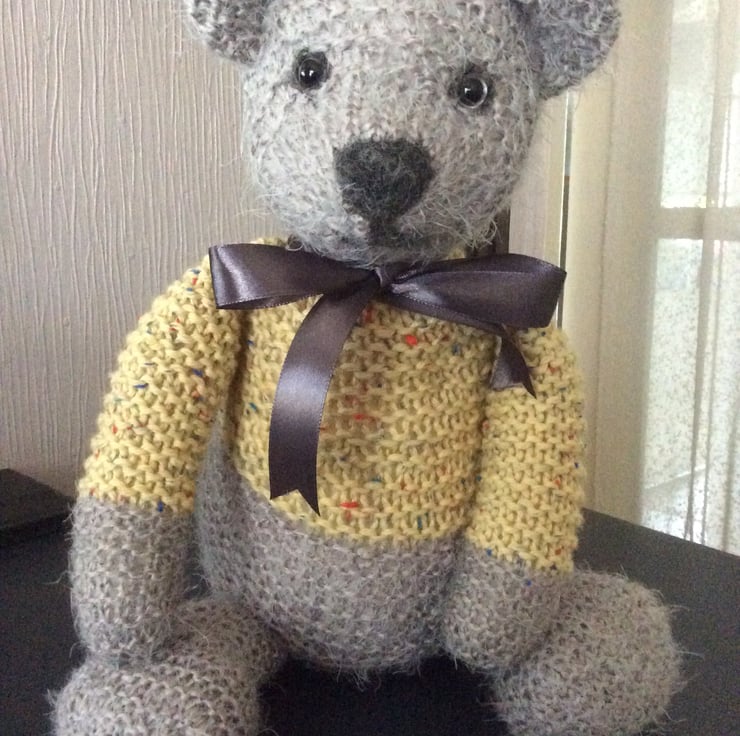 William is hand knitted in a cuddly fluffy knitting yarn in a lovely light grey with a pale yellow upper body which looks like he is wearing a jumper. William also has a pretty dark grey ribbon bow.