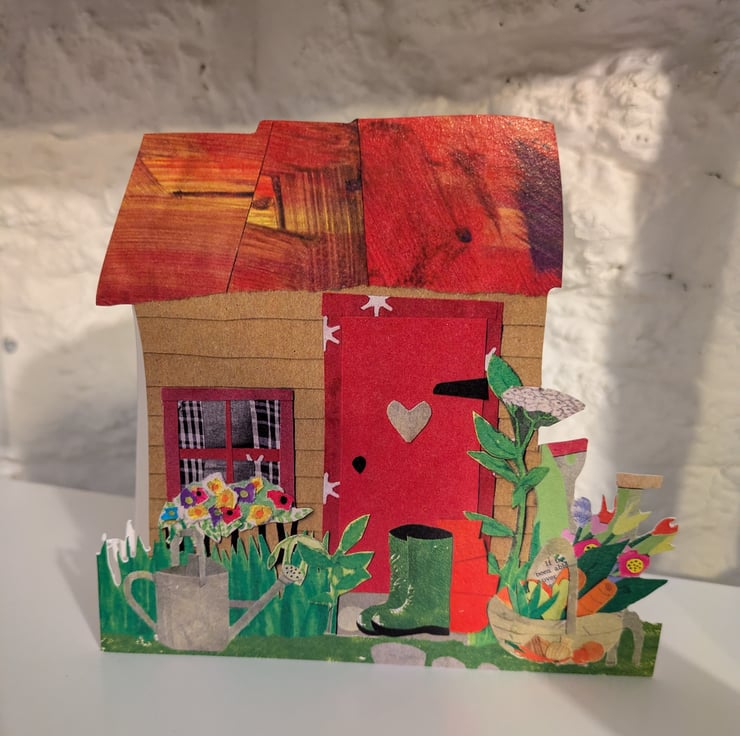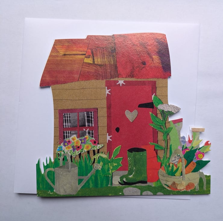 A quirky, rustic, (slightly dilapidated?) garden/allotment shed, complete with the accoutrements of growing - a spade and fork, a watering can, plant pots, wellies and a trug of well-earned produce.