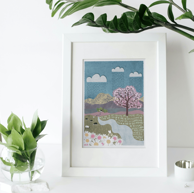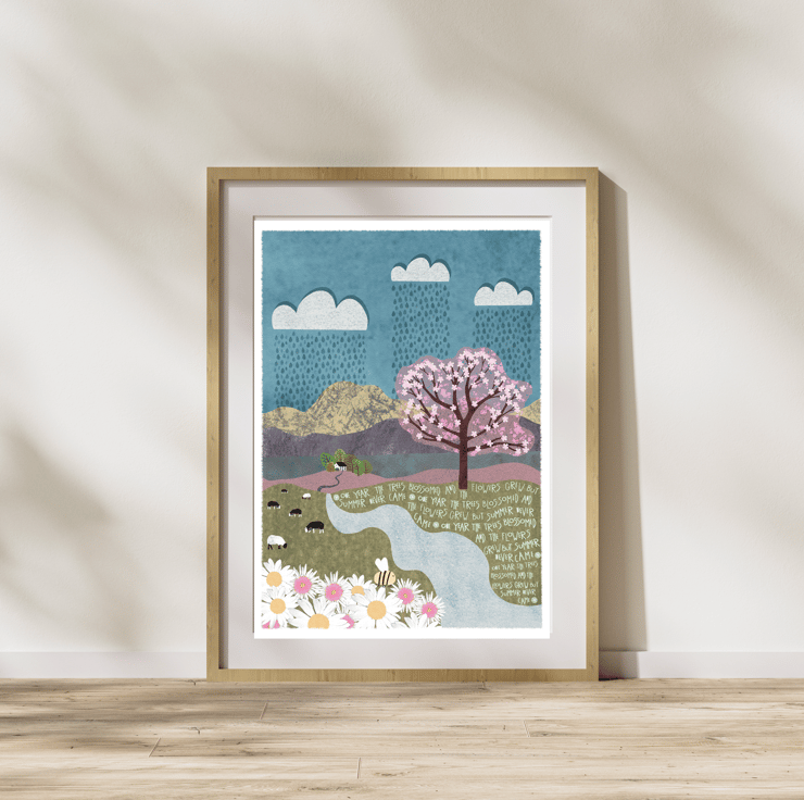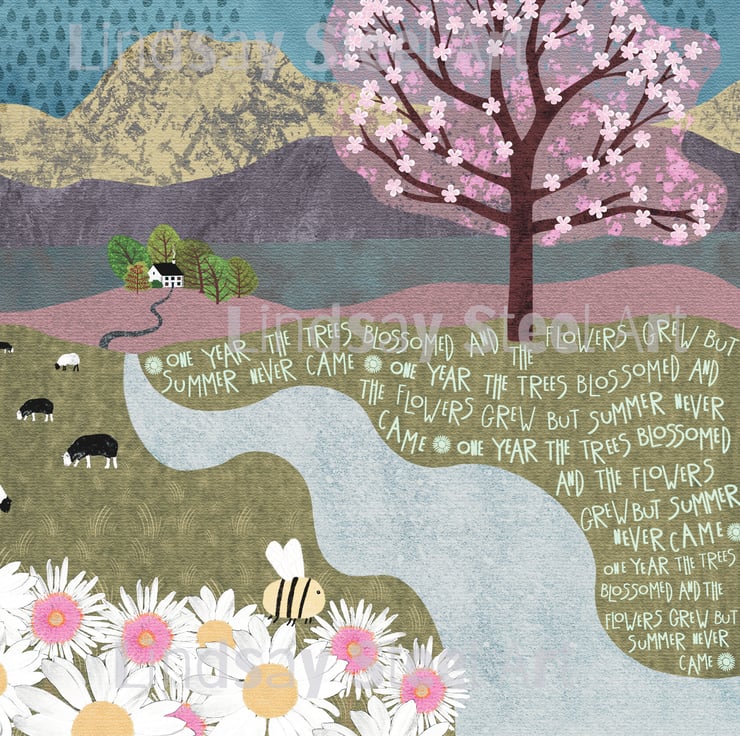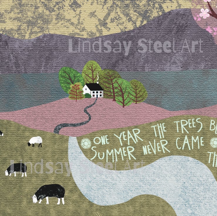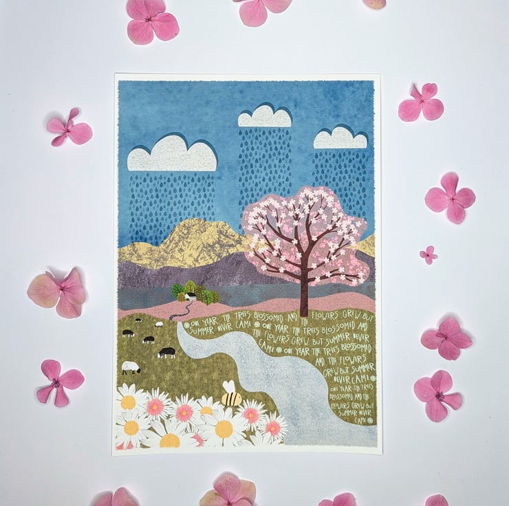 This is an A4 Print of my original digital painting of a little cottage in the mountains one year when summer never arrived. It is summer and the cherry tree has blossomed, the grass has grown and the flowers are in full bloom, but it is raining and the sun just doesn't want to shine.
