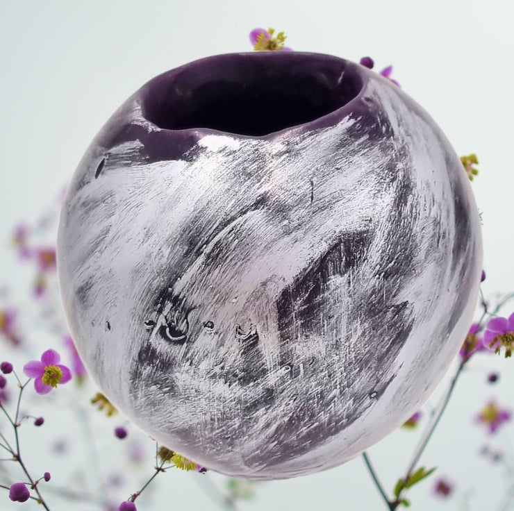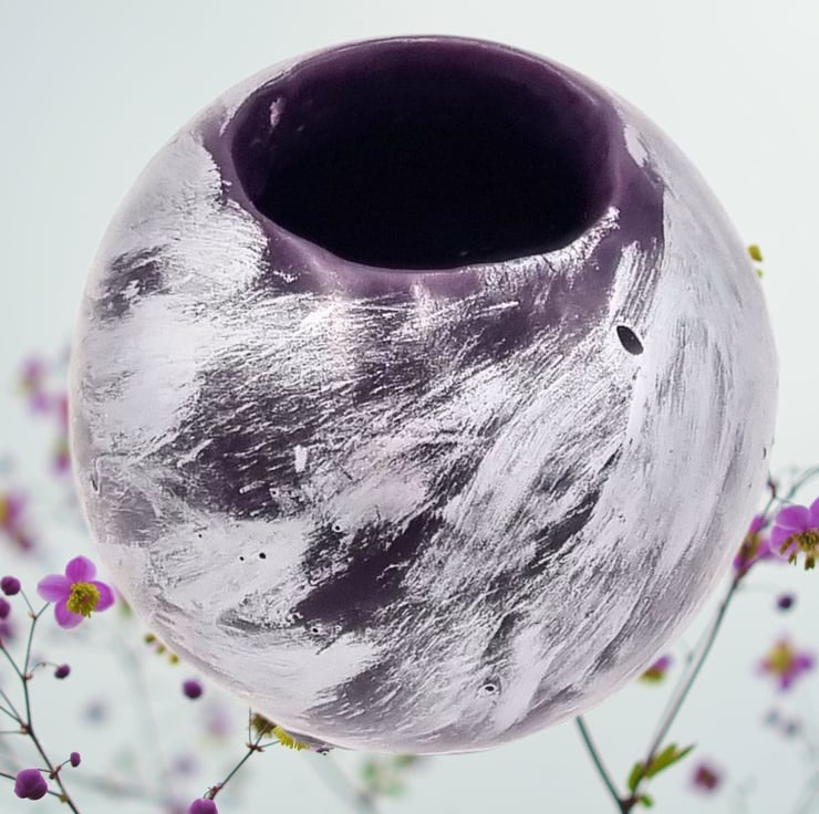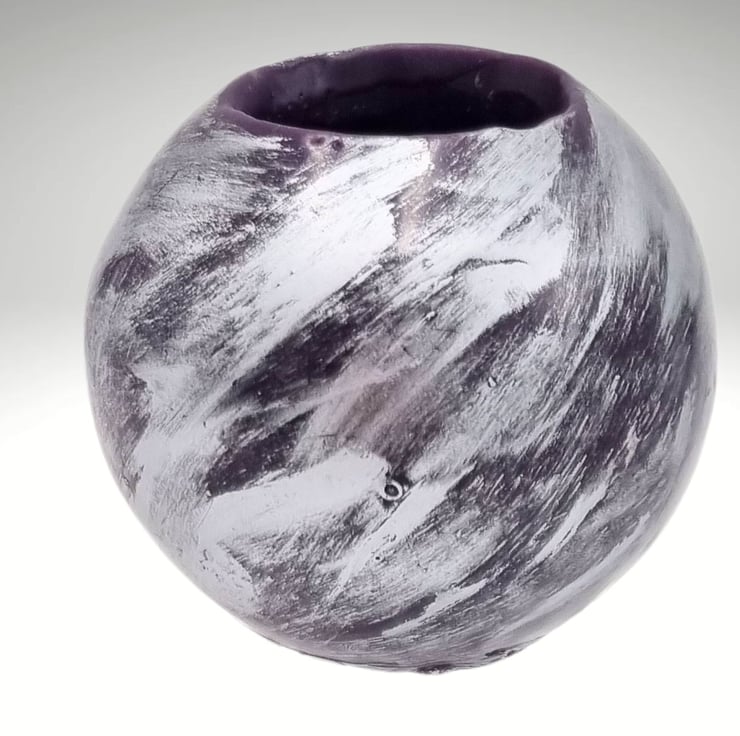 A spherical trinket bowl made from purple wax decorated with silver colour. Great for adding some glitz to your home decor. Ideal dressing table container for holding make up or as a container for bits and bobs in a craft room or home office. It could also be used as a vase for short stemmed flowers.