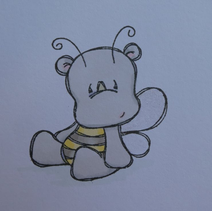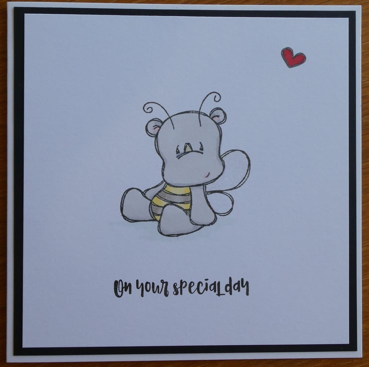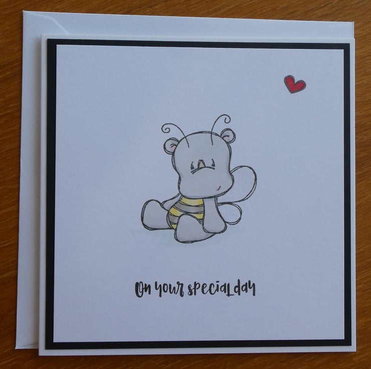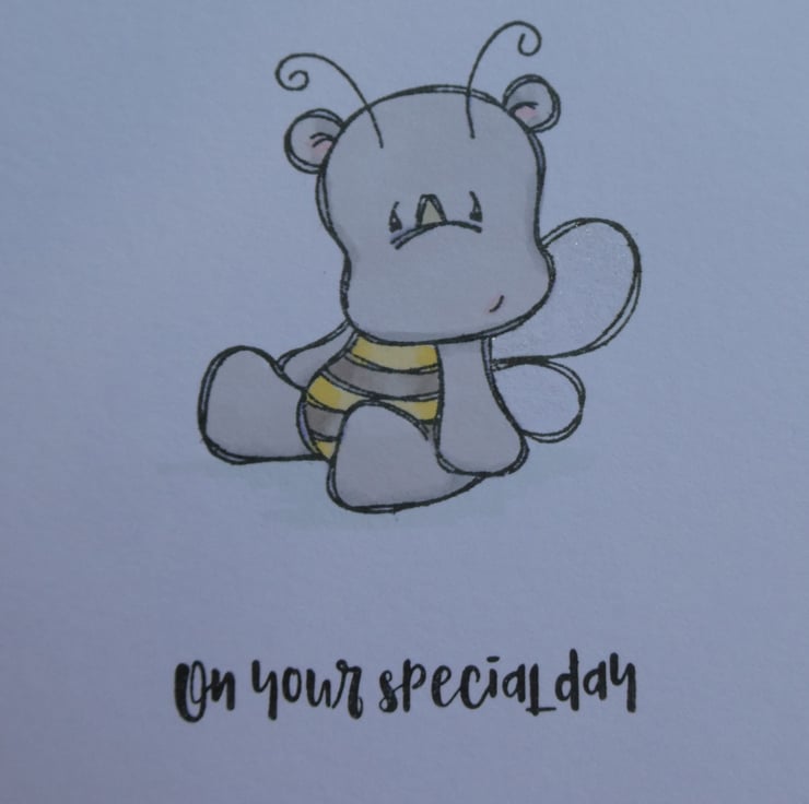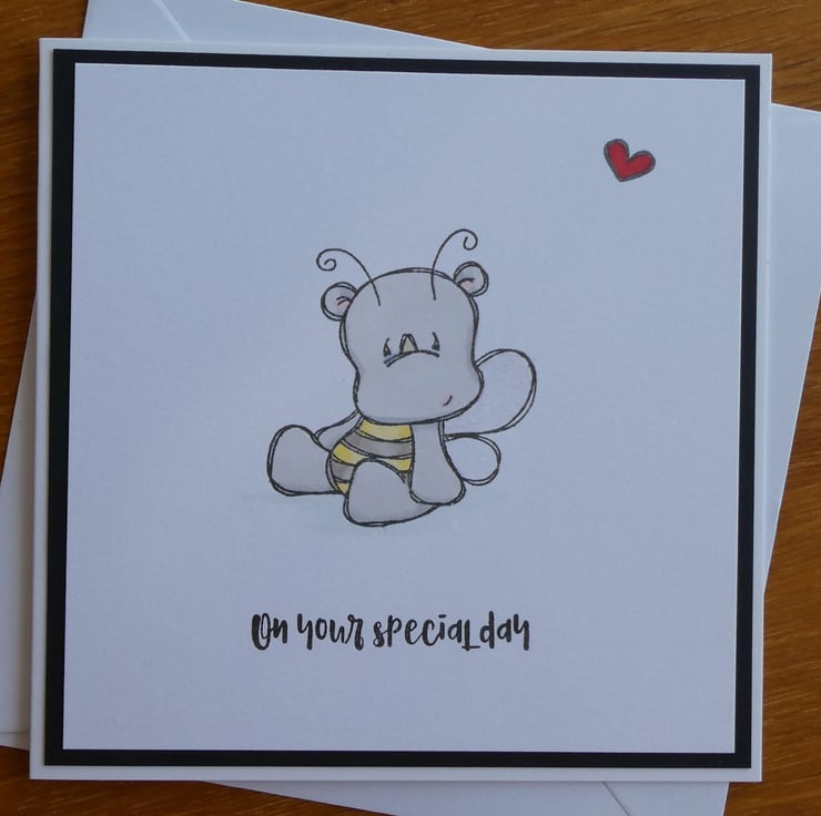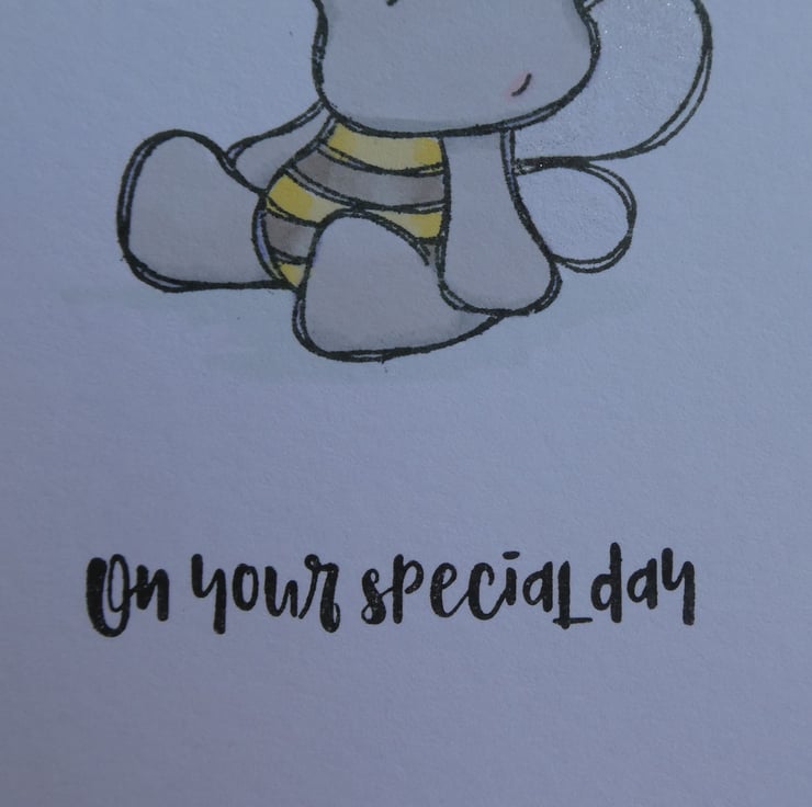 This sweet birthday card has the greeting 'on your special day' so could also be used for other special occasions. It has been hand stamped with an image of a cute rhino dressed in a striped black and yellow bee costume, complete with antennae and shimmering translucent wings.