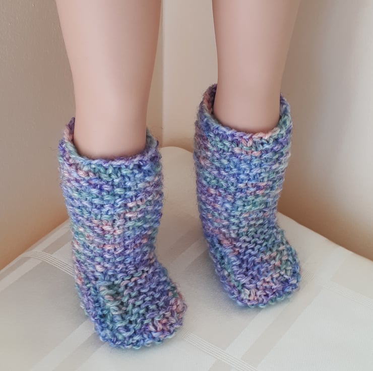 To fit doll Height 46 cm or 18 inches. The boots are knitted in double knitting yarn using 3.25 mm knitting needles and are knit flat and seamed.