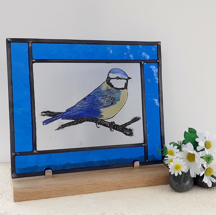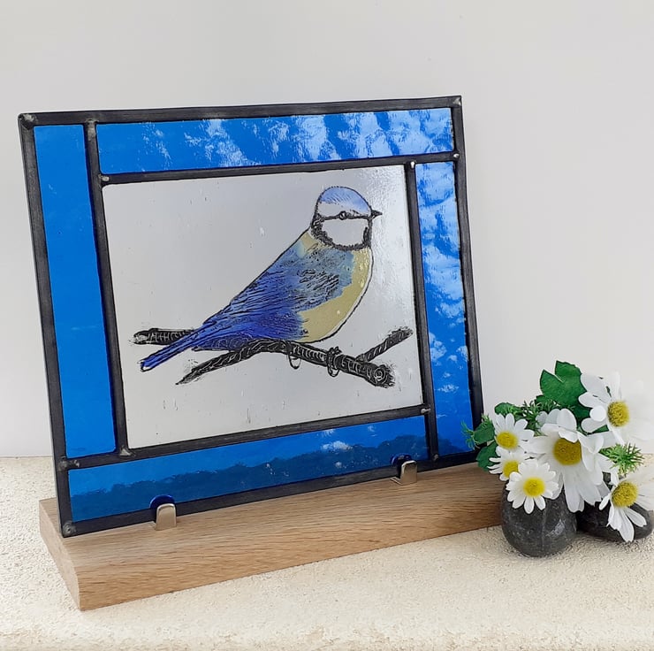 This stained glass panel features a painted blue tit central insert, created using specialist glass enamels painted onto a clear, 'seedy' textured piece of glass, and kiln-fired to make the enamel permanent. The panel was then constructed using traditional leaded stained glass techniques, which have changed very little over the centuries. I set the blue tit in a surround of vibrant blue transparent art glass, using lead came, which was cut to size, soldered, and then cemented, black-leaded and finally polished.