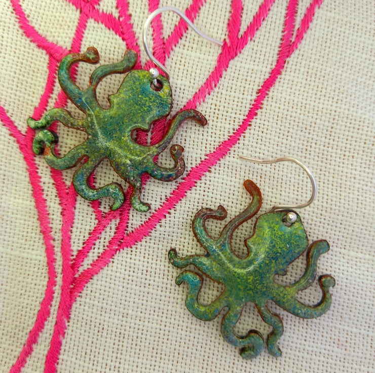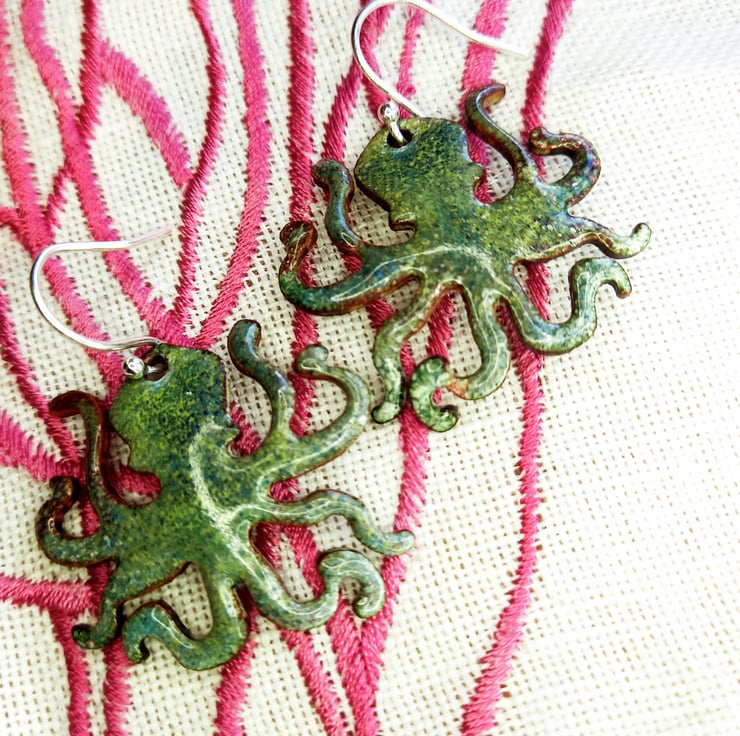 Green octupus enamelled earrings. Glass powdered enamel melted ontop of cut copper shaped metal at over 800 degrees centergrade.