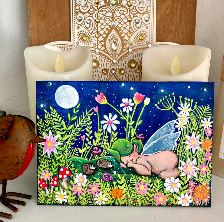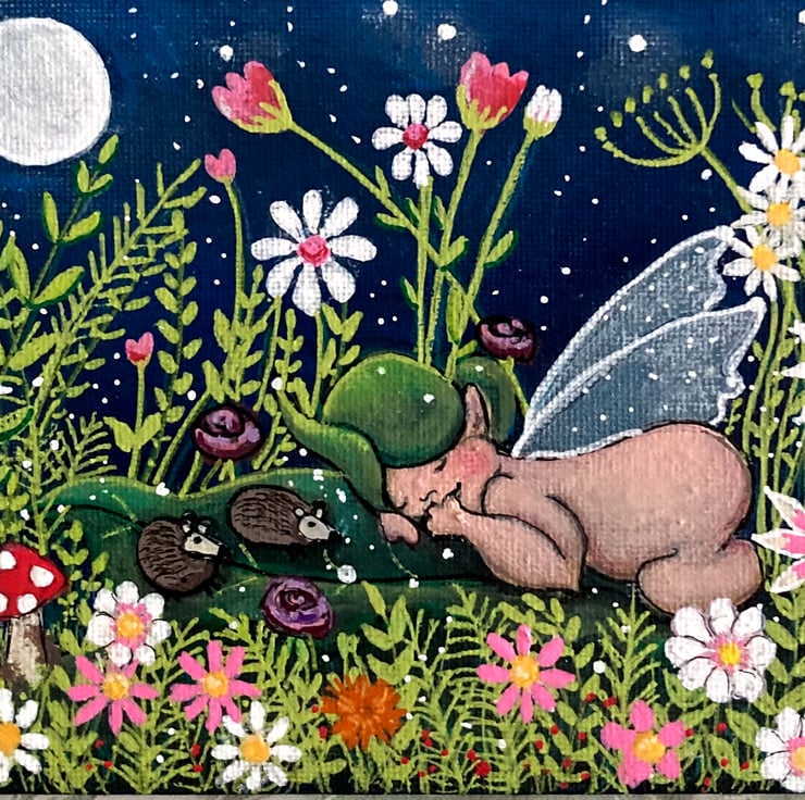 This painting is of a young Fairy fast asleep under the stars with her hedgehog friends for company.