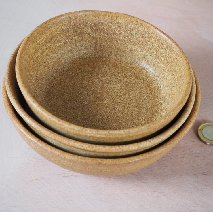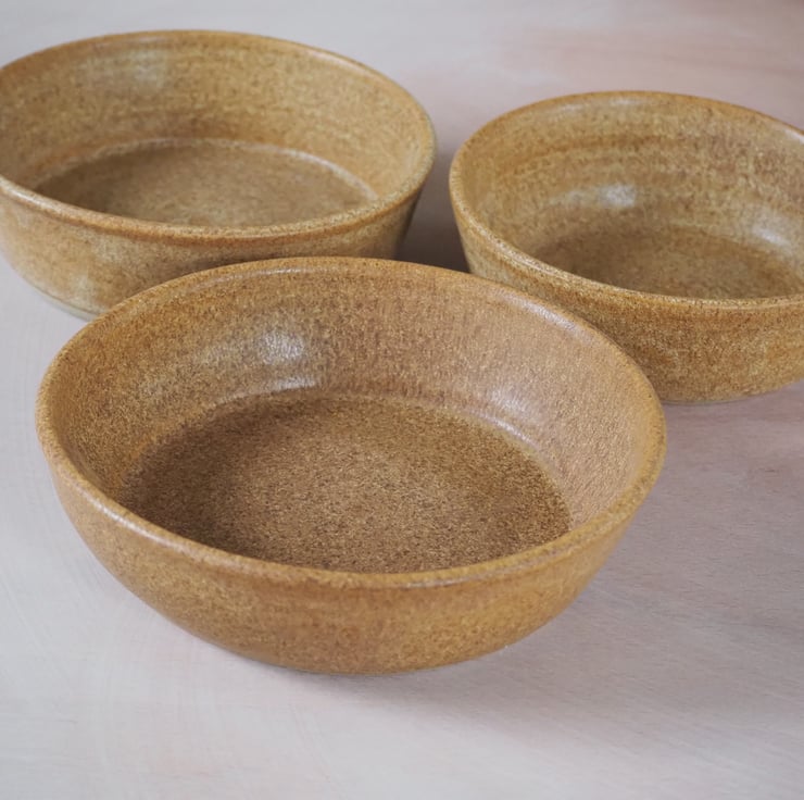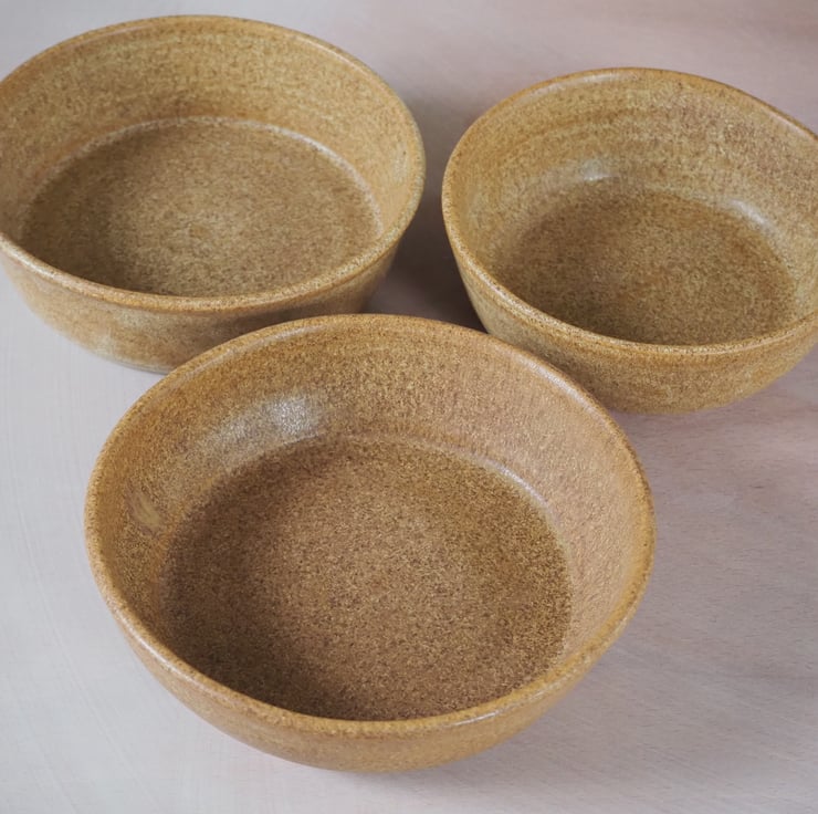 A set of three stoneware bowls. Stackable and great for snacks, nibbles or food/water bowls for pets. Hand thrown on my potters wheel. Finished in a natural sandy brown glaze.