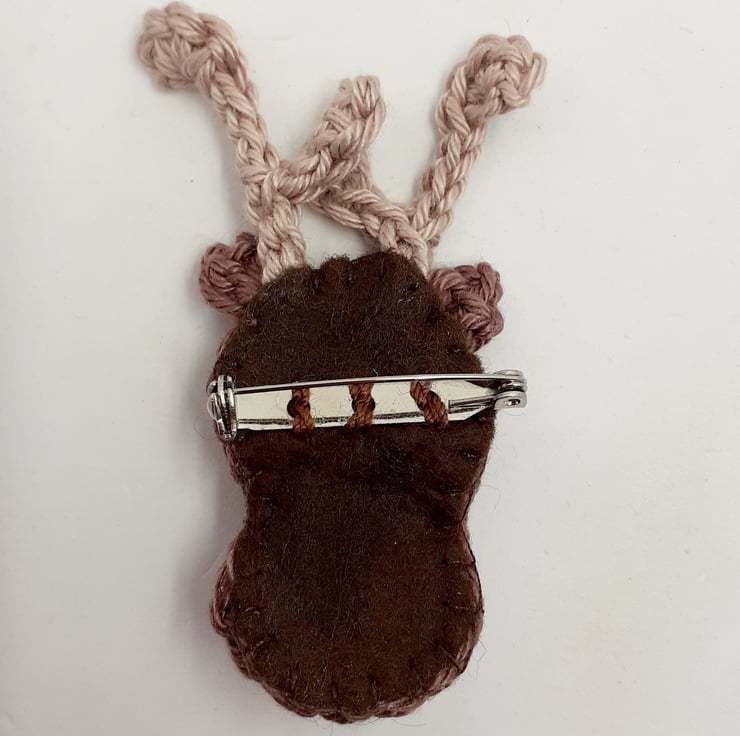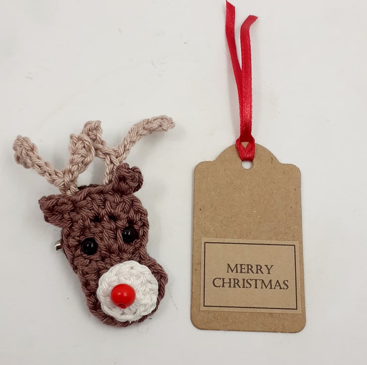 A festive greeting this year and a fun Christmas brooch for many years to come this little fellow is a novel alternative to a seasonal card! The reindeer is crocheted in cotton and has a wooden bead for a nose and black safety eyes. It is backed with a layer of stiffened felt for stability and has a brooch pin firmly sewn in place. The head measures approximately 5 cm long excluding the antlers. The tag reads 'Merry Christmas! ' The brooch comes wrapped in tissue in a labelled PIP ( Postage in Proportion ) box all ready to be given or posted on.