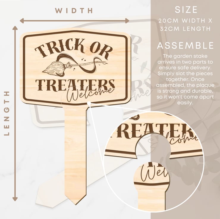 Make your home the ultimate Halloween destination with our "Trick or Treaters Welcome" garden sign. Perfect for creating a festive and inviting atmosphere, this charming outdoor decoration lets your neighbourhood know you're ready to embrace the Halloween spirit. Whether placed in your front garden, porch, or driveway, this sign is sure to delight both little trick-or-treaters and their families.