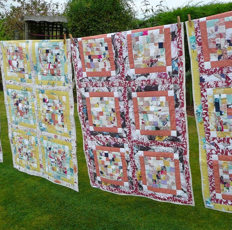 This patchwork polyester cotton lap quilt has been made from very small pieces / offcuts from my upcyclying projects. The quilt is made up of 6 x 10" squares with lots tiny pieces then has larger pieces added to make the pattern, this is called a crumb qulit, because you use crumbs of fabric