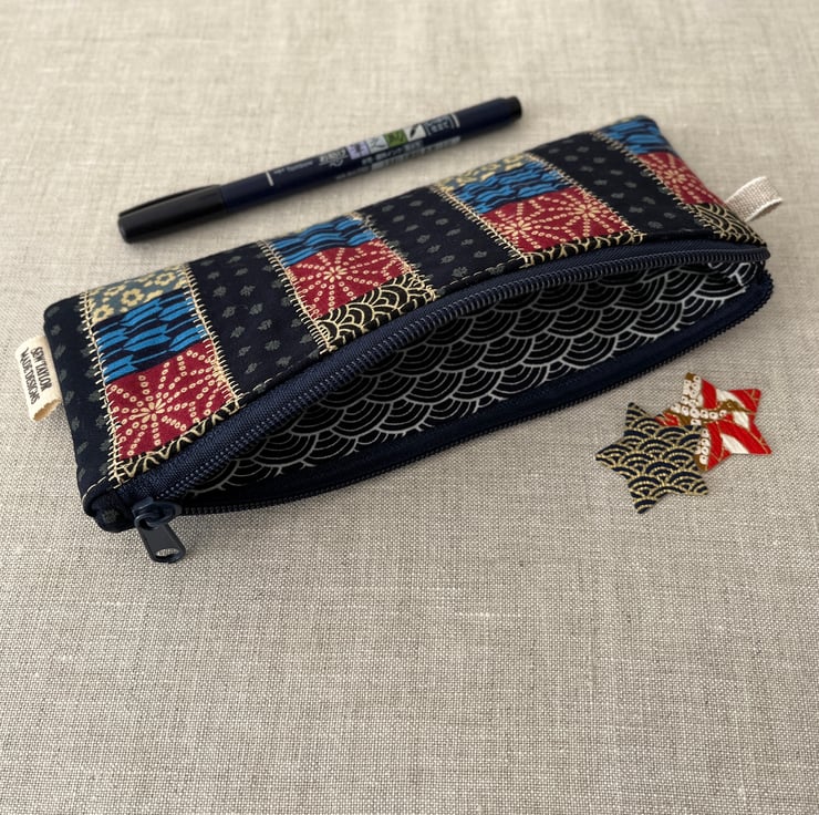 This lightly padded pencil case has been created using an array of Japanese cotton patterned fabrics. The patterns include various forms of asanoha (hemp leaves), seigaiha (waves), yagasuri (arrows) and flowers. Inside is lined with cotton seigaiha fabric.