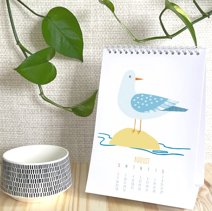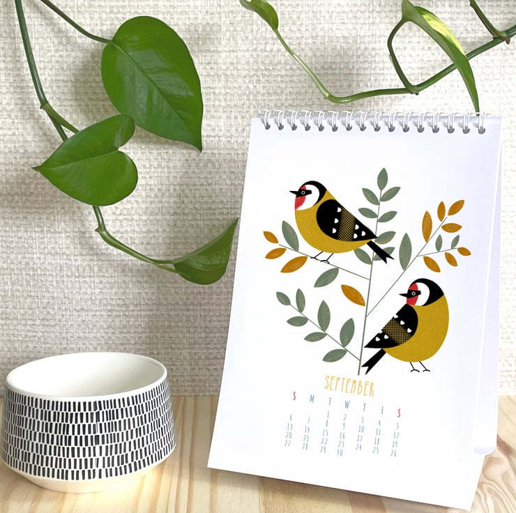 A unique desk calendar for 2026 featuring 12 modern British birds illustrations.