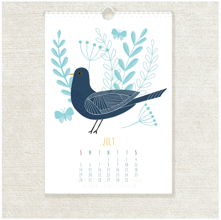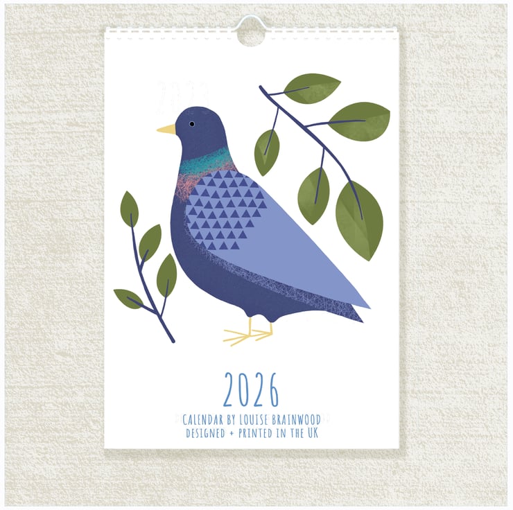A unique mini wall calendar for 2026 featuring 12 modern British birds illustrations.