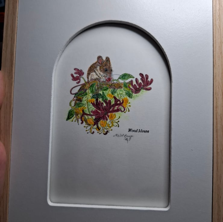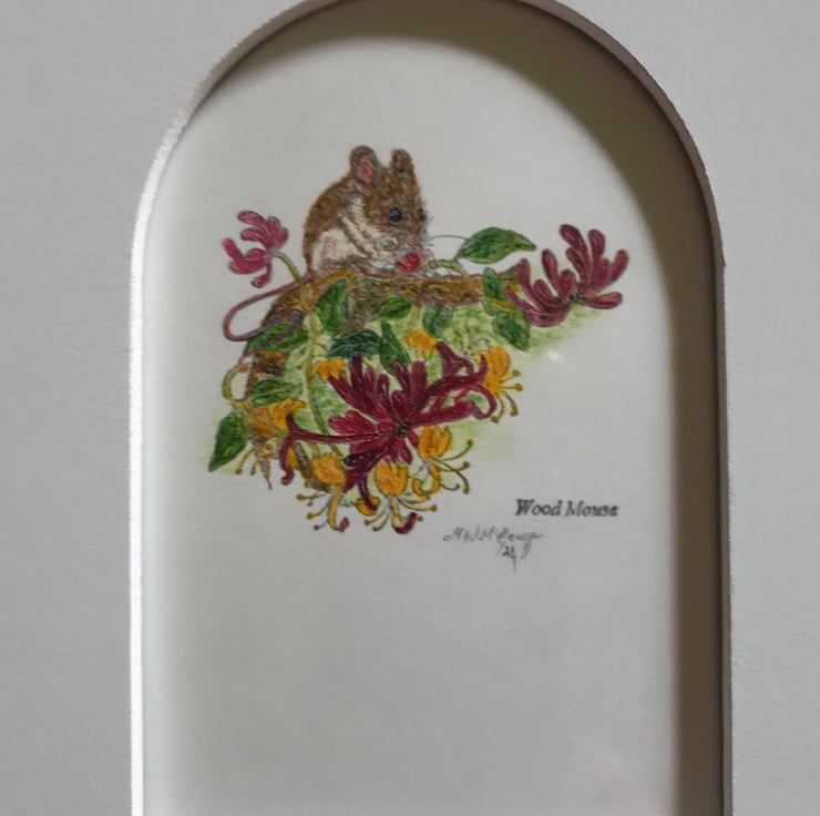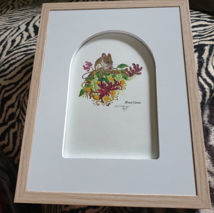 An Exquisite Original Mixed Media And Water Colour Picture Entitled Field Mouse In The Honey Suckle, The Design Done In Water Colour And Mixed Media Shows A Cheeky Little Field Mouse Sitting Amongst The Honey Suckle While Nibbling On An Early Honey Suckle Berry, The Picture Is Framed In A Cream Sycamore Coloured 17cm x 22cm Frame, The Frame Colour And Arch Window Mount Enhances The Beauty And Realism Of the Art Work And Subject, Which Is Lovingly Created For Your Enjoyment Also Prices Reflect The Hours Of Creating This Unique Art Piece And The quality Of Materials Used.