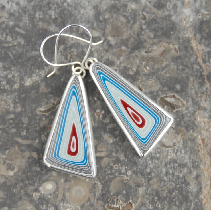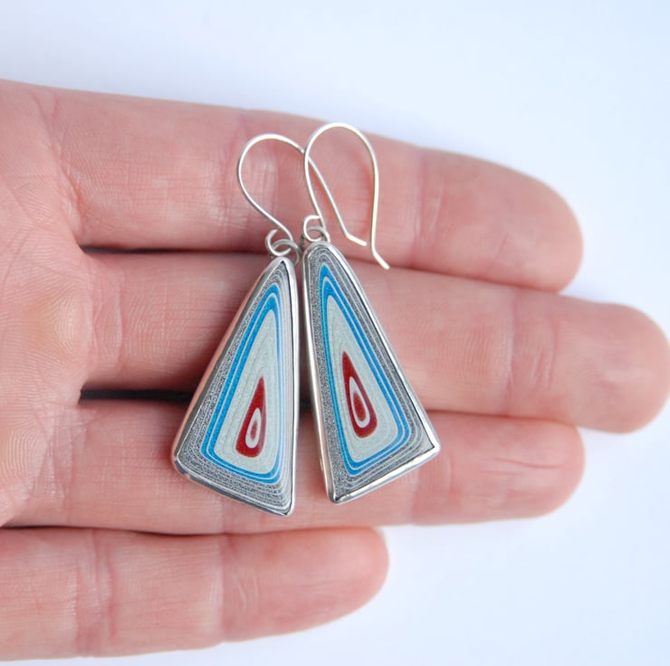 These super sparkly earrings feature triangular drops of fordite which has been bezel set in sterling silver and then finished with simple silver hooks. The fordite has concentric rings in sparkly shades of silver blue, dark grey and bright blue with a central red patch. The rings of colour are separated by fine lines of pale grey primer. The earrings measure approx 50mm from the top of the hook to the bottom by 16mm across, fordite is super light weight to wear. Comes gift boxed.