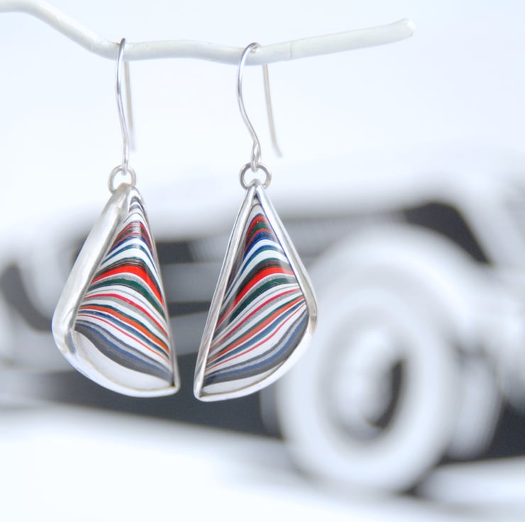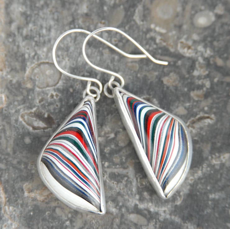These dangly earrings feature rounded triangular drops of fordite which has been bezel set in sterling silver, the earrings have been finished off with sterling silver hooks. The fordite has a pattern of stripes in shades of white, red, orange, black, grey and silver, some of the bands sparkle in the light. The white at the bottom of the drop is the outer layer of this particular piece of rough, the drops were cut as a sister pair (ie side by side) so they almost match and you can see how the bands go from one drop to the other. These fordite earrings measure approx 45mm from top of the hook to the bottom of the drop by approx 15mm wide. Comes in a gift box.