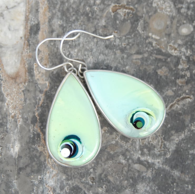 These unusual earrings feature drops of Cornish surfite which has been bezel set in sterling silver and finished off with a simple sterling silver hook. The surfite is a pastel minty aqua colour (one is bluer than the other) and has a swirly 'eye' at the bottom in darker shades of teal and green, they aren't an exact match but work well together. These dangle earrings measure 48mm (from top of the hook) by 19mm, surfite is lightweight so comfy to wear all day. Comes gift boxed.