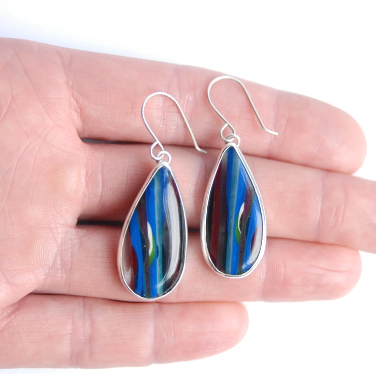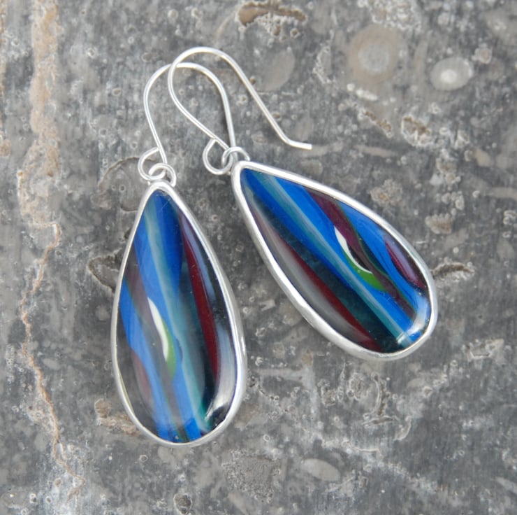 These classic drop earrings are given a modern twist by featuring Californian surfite bezel set in sterling silver finished with simple silver hooks. The drops of surfite are a well matched pair with vertical wavey stripes in maroon and blue, most of the bands are opaque but a few are translucent. The open backed settings allow light to pass through the surfite so it looks subtly different depending on the lighting.The earrings measure approx 47mm top of hook to bottom and 15mm across. Comes gift boxed.