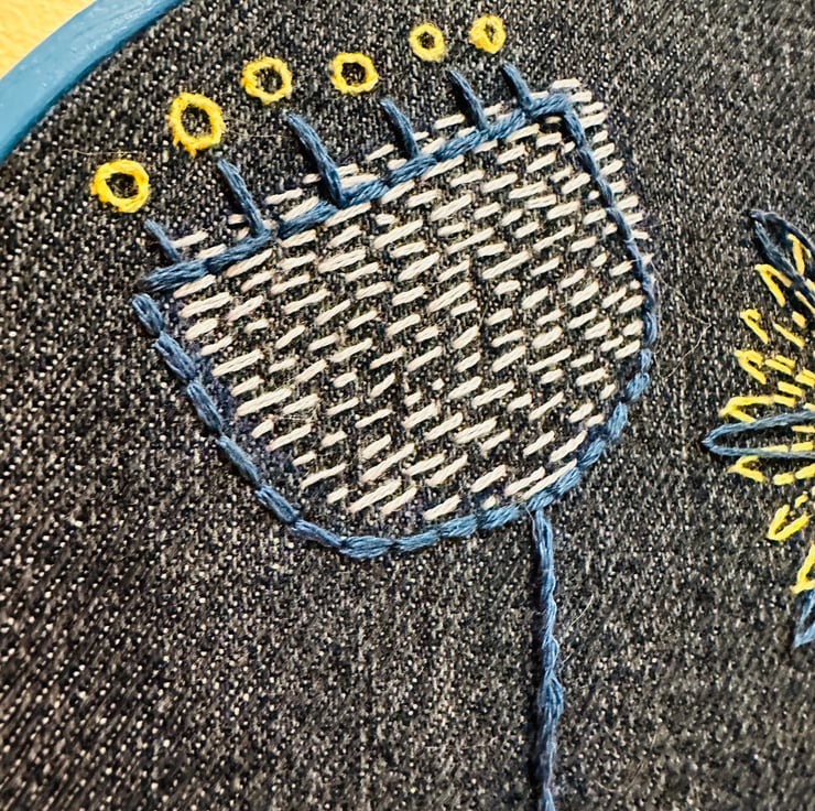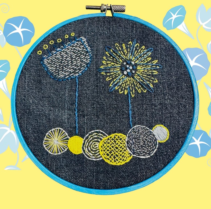 The bright yellow and blue against the deep dyed denim bring a cheerful look to this piece of work. The two flowers, hand drawn and sewn, with the abstract fallen petals underneath in various stitches add depth and texture to the piece. Quality, colour fast DMC cotton floss has been used.
