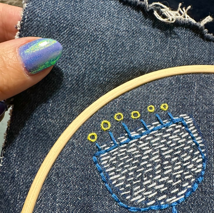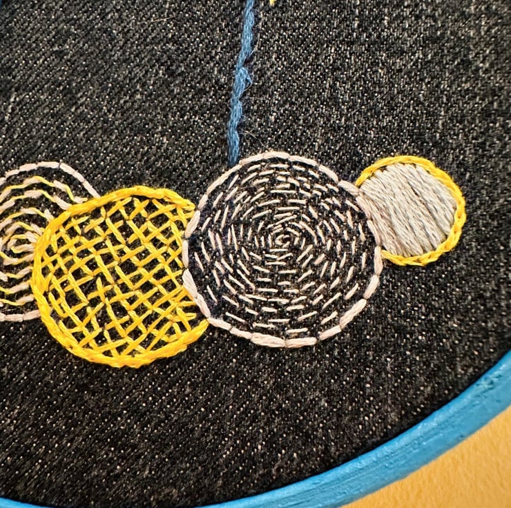 Embroidery Denim wall hanging with abstract flowers in blue hoop frame. Recycled