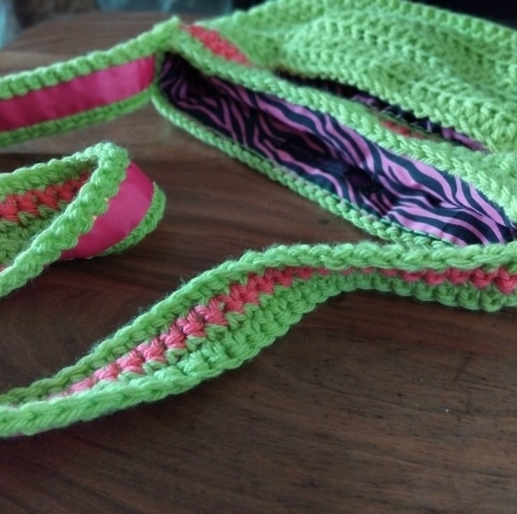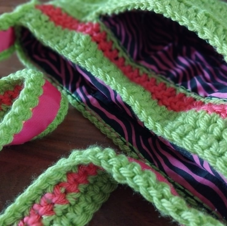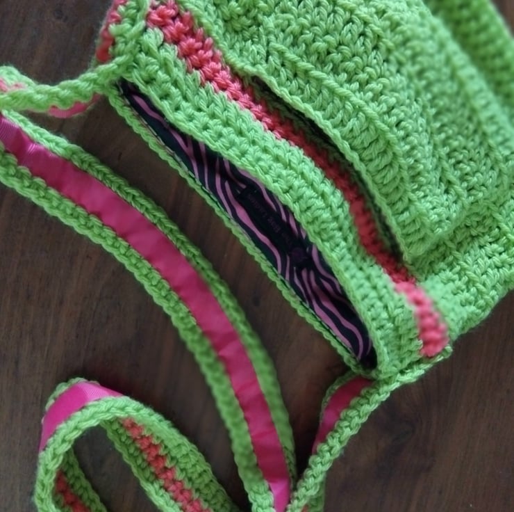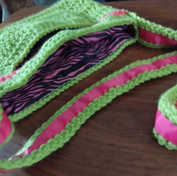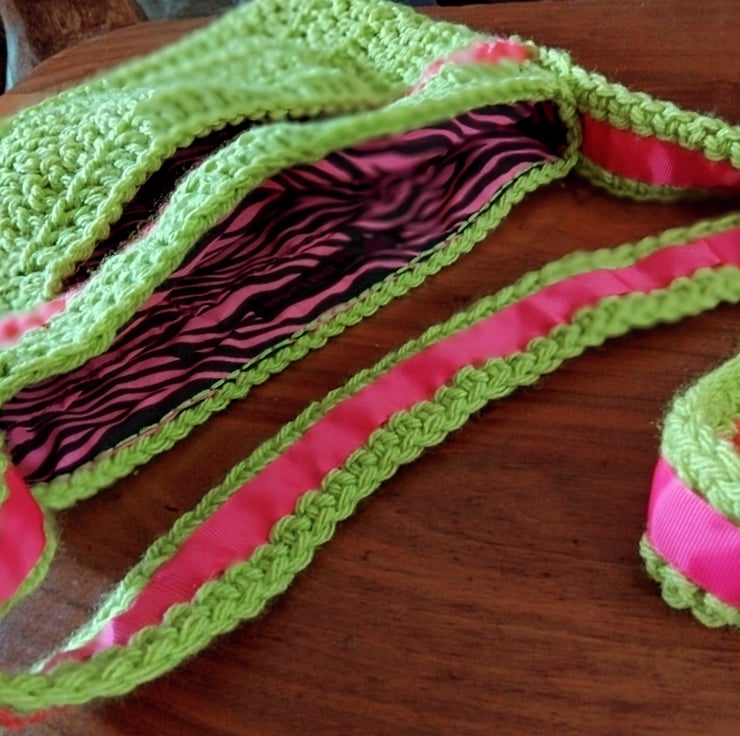 Crochet handbag in mouthwatering venus flytrap green with flashes of hot pink.