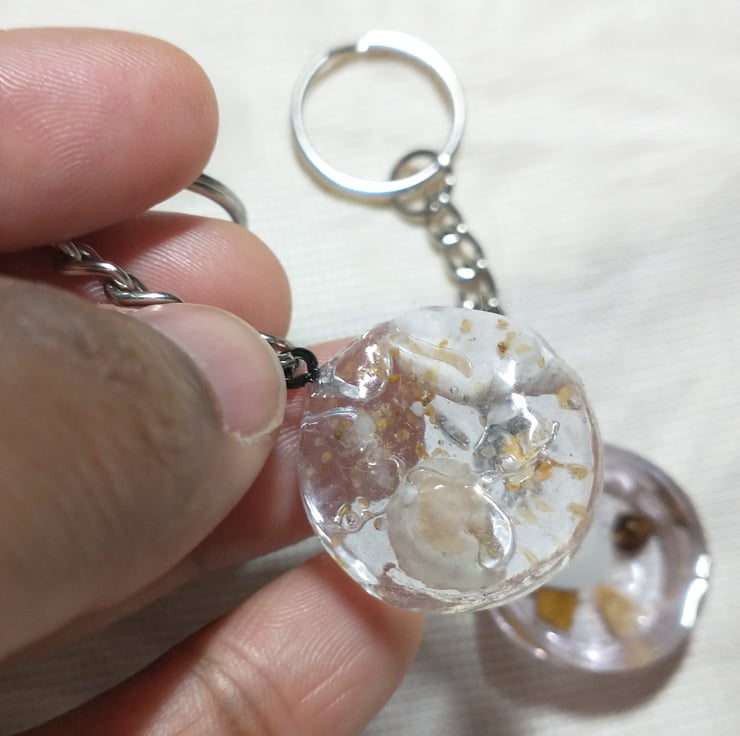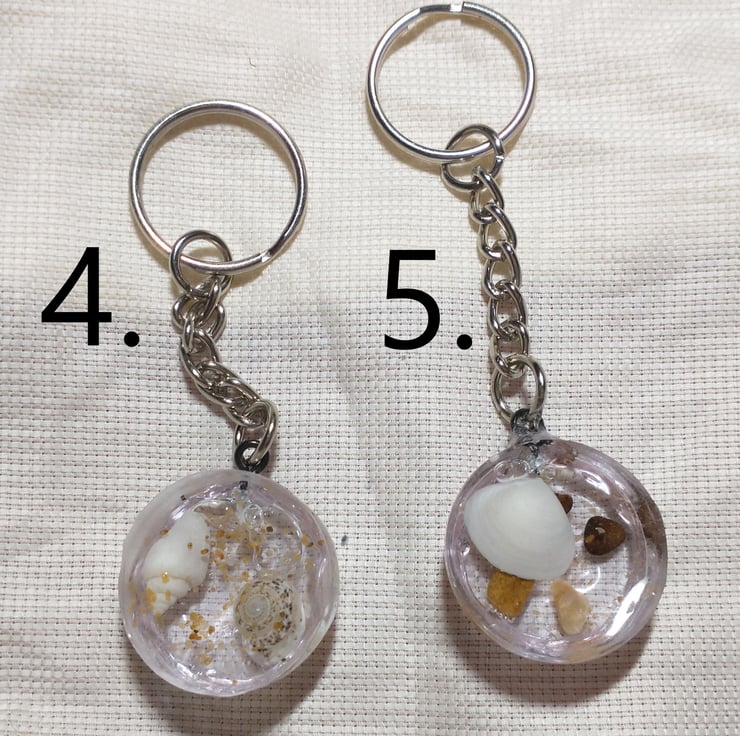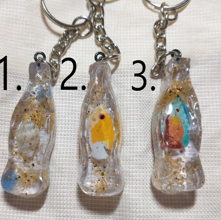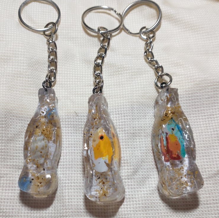 Little resin keyrings with either a fish or ocean theme. Each one is unique and is either in a bottle or round shape with real seashells, sea glass and sand. Some have painted fish instead (only in the bottle shapes). The perfect gift for fish fanatics and seaside goers.